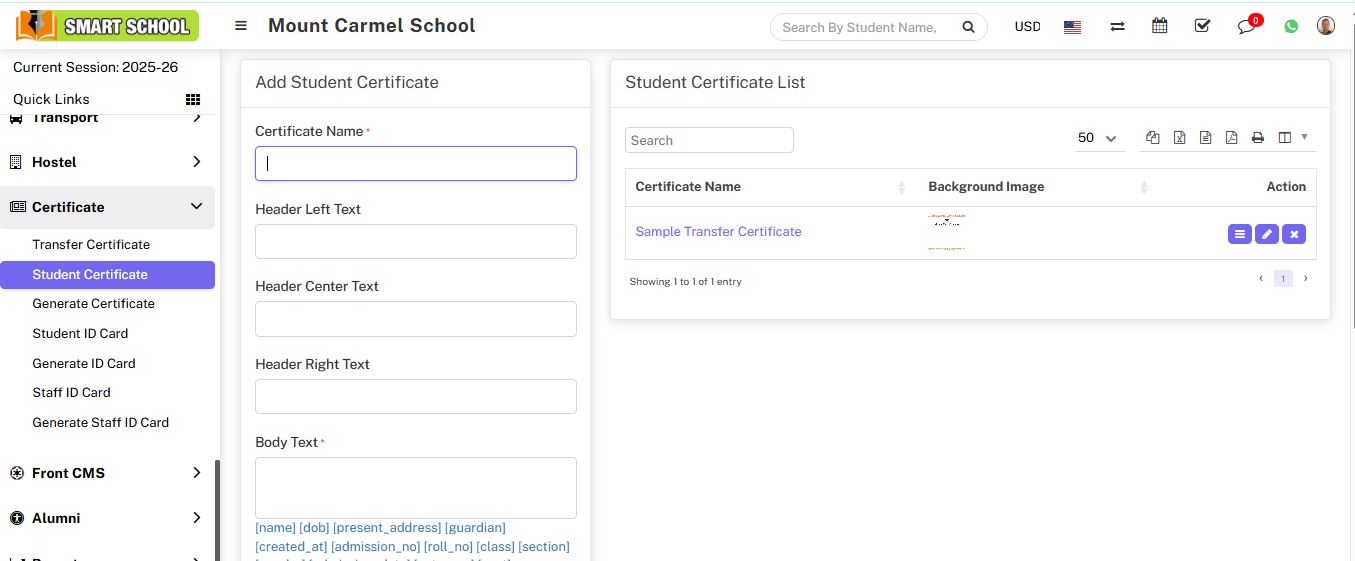 Certificate Module Workflow- First we will design student certificate or id card then we will generate/print them. If you will properly configure background, height, width etc. settings then you can design professional quality certificate or id cards very easily.