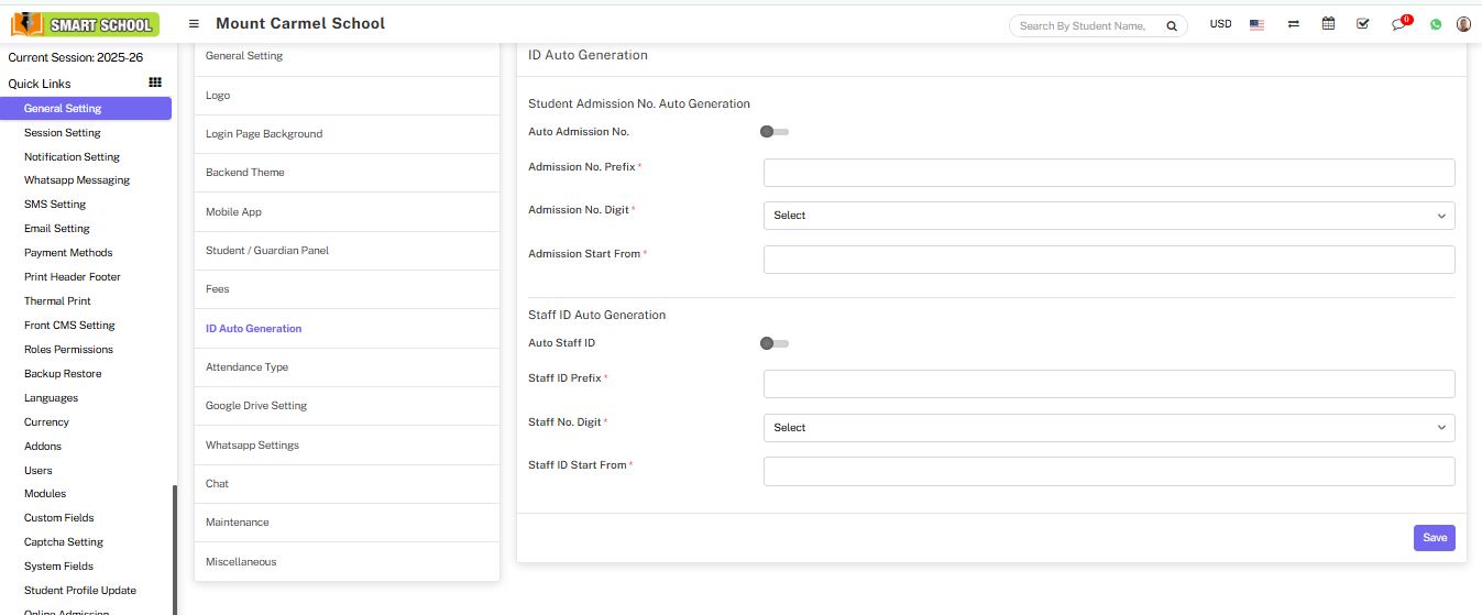 If you keep this mode enabled, than you do not need to manually generate the staff id, it will generate automatically. To Generate Staff ID Auto Generation you have to fill the Staff ID Prefix, Staff No. Digit and Staff ID Start From and click on save button, your Staff ID Auto Generation will be active.