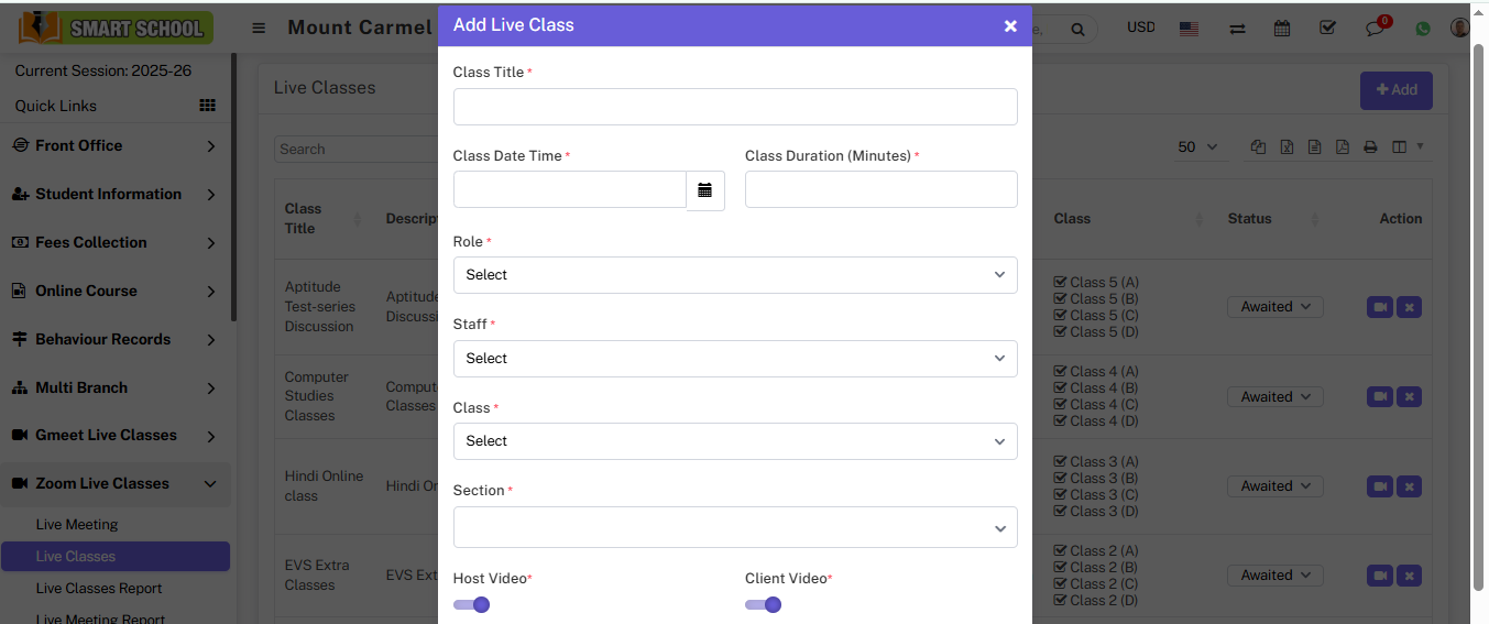 Note: Zoom Live Class is Smart School addon so to use it you should purchase separately and install it in your Smart School.