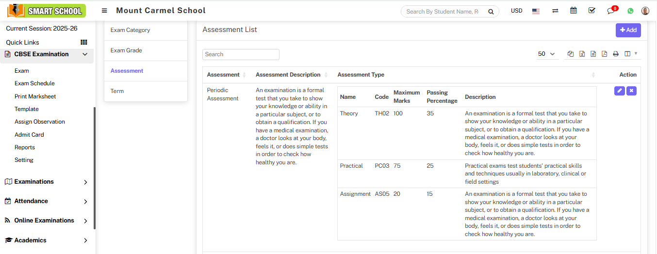 To Edit the assessment, go to CBSE Examination > Assessment. The assessment list will be displayed, and on the right side, the Action column will be visible. To initiate the edit, simply click on the pencil icon, which will open the Edit Assessment model.