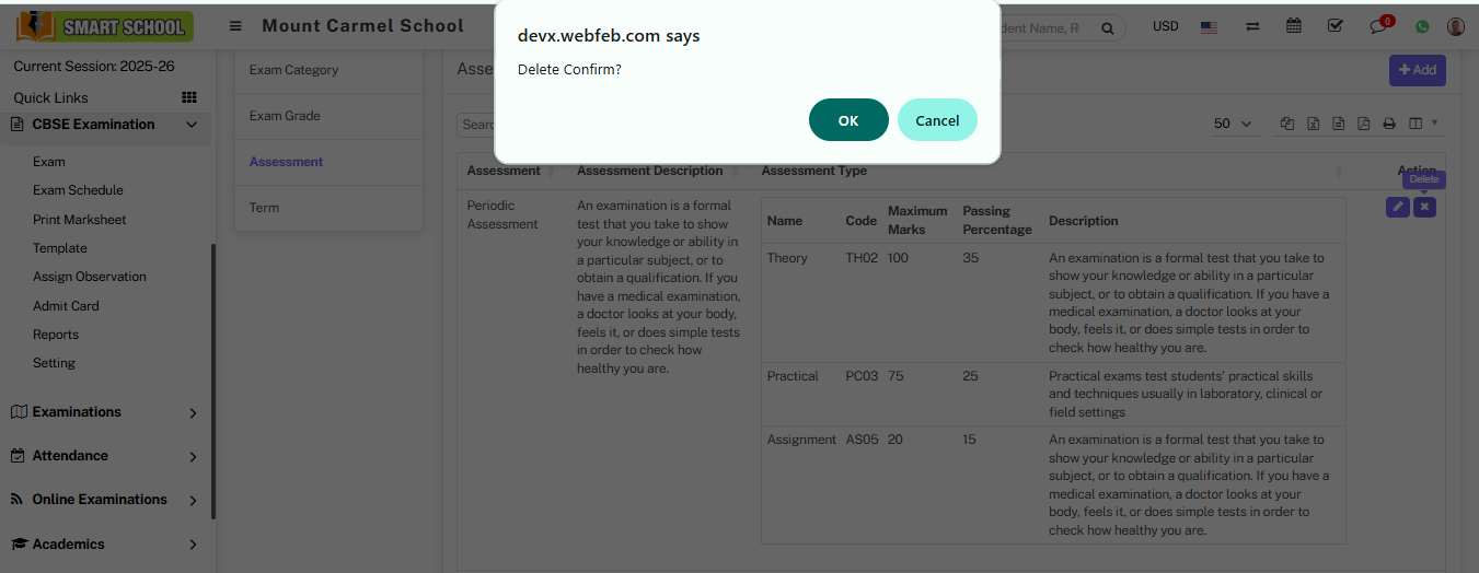 To delete the Assessment, simply click on Delete icon which is showing in action column, Delete Confirmation model will be open.