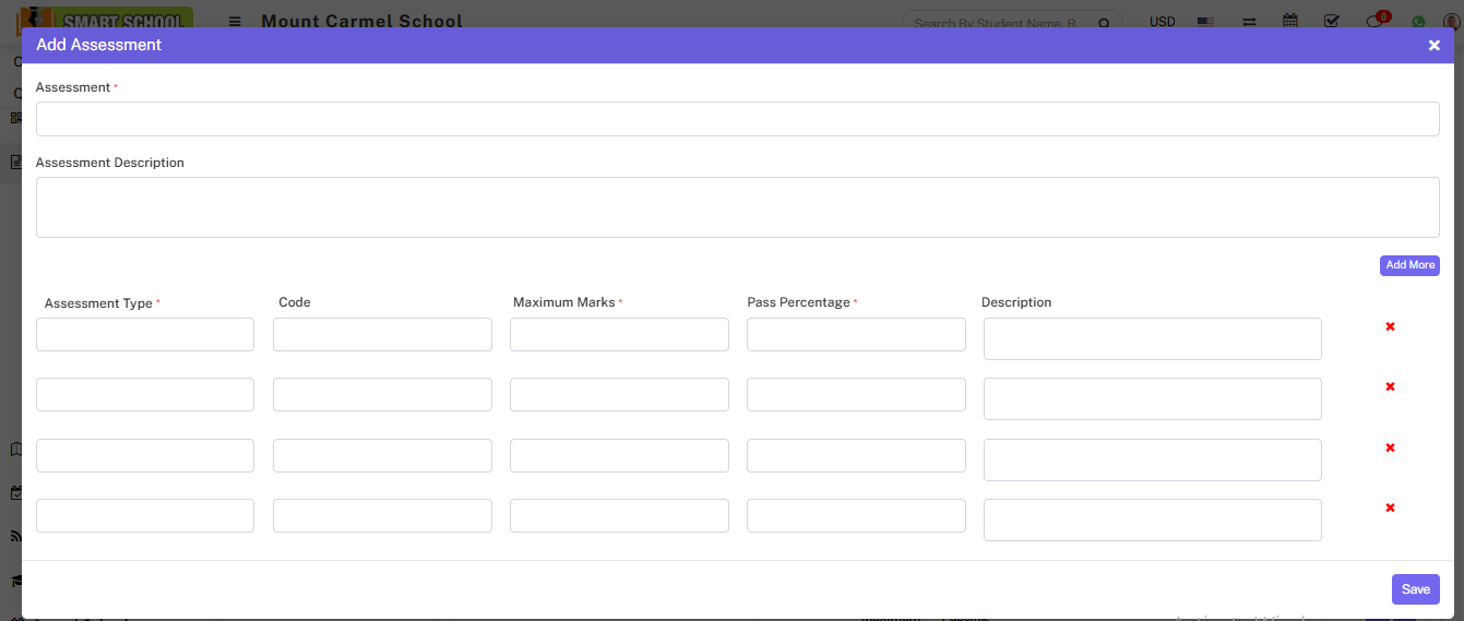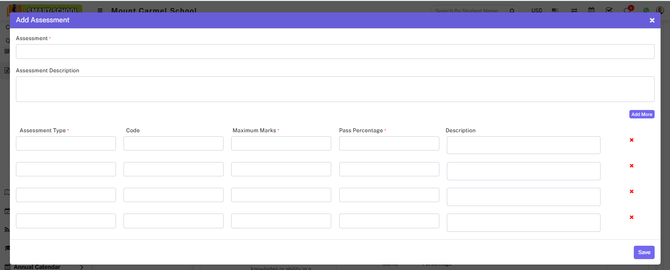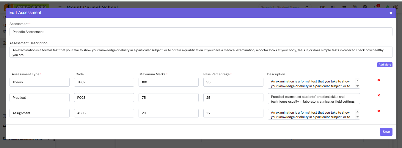 Now fill the name of assessment and right the description about the assessment and in below you can fill the assessment type (it could be theory and practical etc.), fill the code of Assessment Type, and fill the Maximum Marks, Pass Percentage and the description. If you want to more assessment type simply just click on Add More button, the multiple inputs will be open.