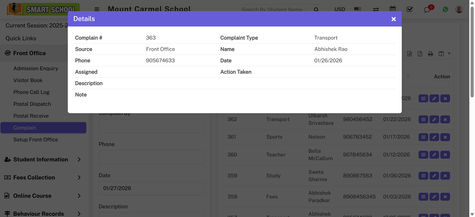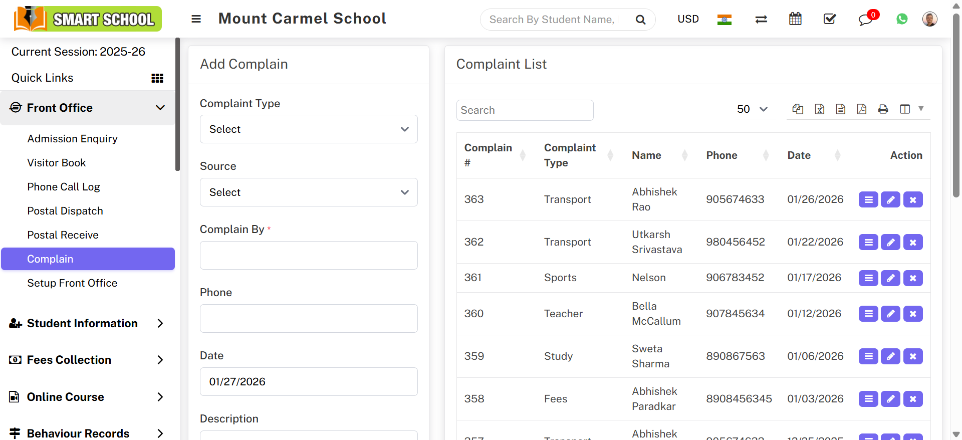 To add complain, go to Front Office > Complain then select Complaint Type, Source, Complain By, Phone, Date, Description, Action Taken and Assigned, Note and Attach Document and then click on Save button. You can view this added complain in the Complain List on the right side of this page.
