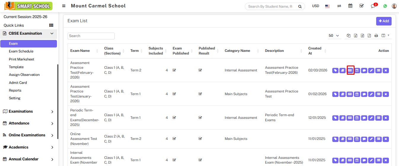 To add the marks, go to the CBSE Examination > Exam. Exam list will be open on the right side, now in action column, you can see the Exam Marks icon which is showing in beside of exam subjects.