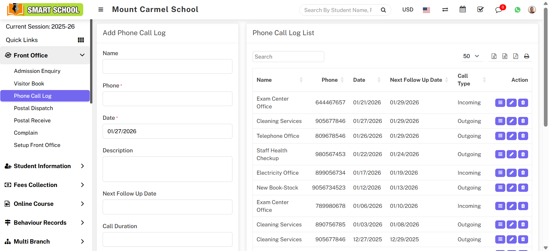 To edit phone call log click on Edit icon and to delete phone call log click on Delete icon present in the phone call log list.