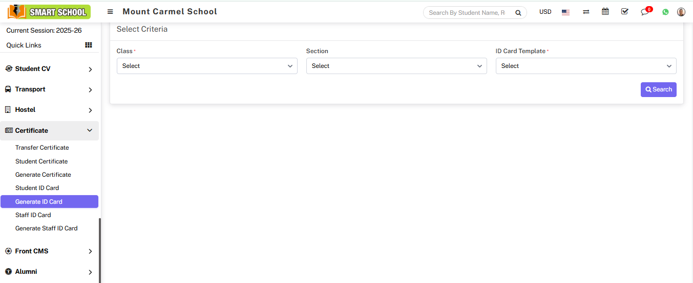 Now, Go to the Certificate tab and select "Generate ID Card." Now select Class, Section, and ID Card Template, and click on the Search button.
