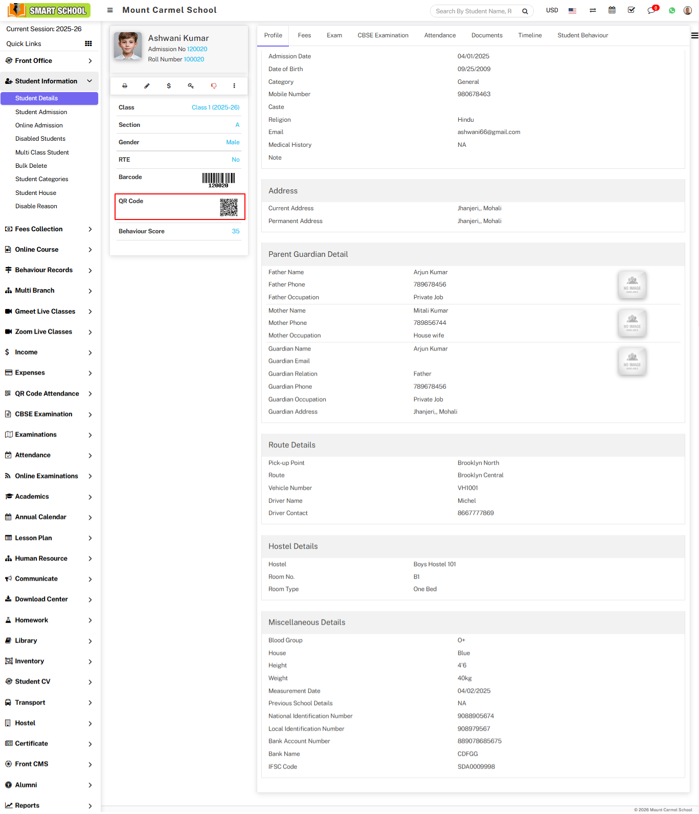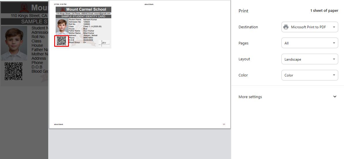 Student ID card will be generated successfully and on this student ID card you can also see the QRcode, which is showing in below.