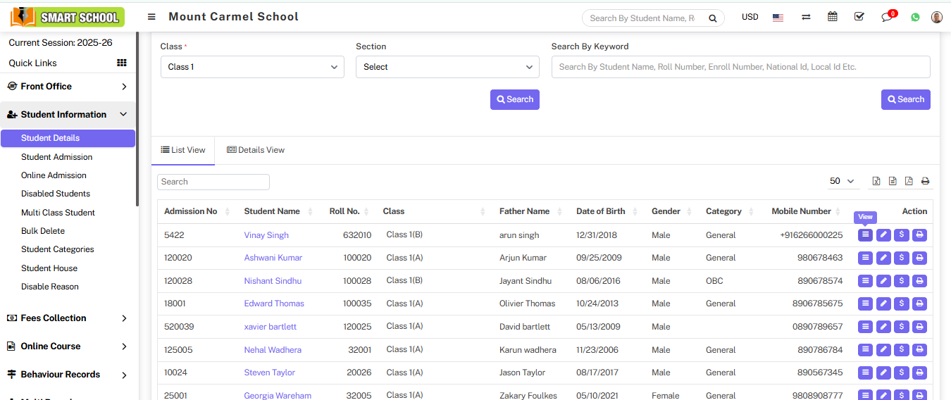 Student list will be open in below, now open the student profile, by click on View icon or student name.