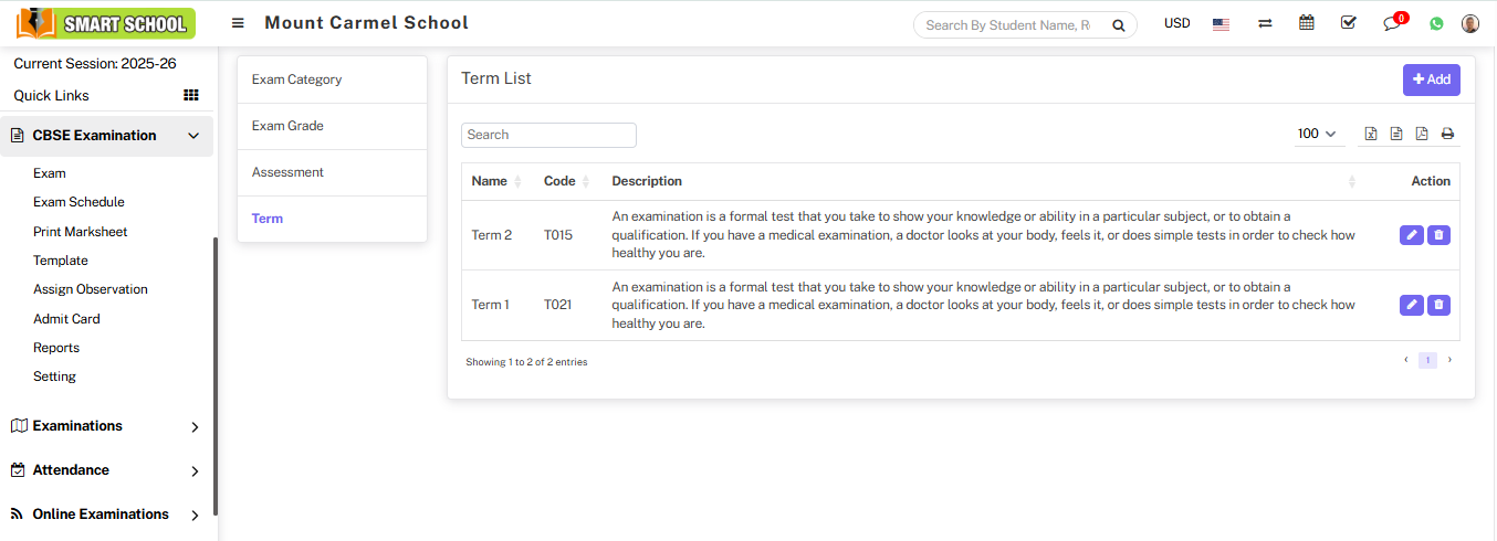 To delete the term, go to the CBSE Exam > Term. The term list will be displayed. On the right side you will see the Action column, in this action column there is the delete icon showing, simply click on the Delete icon, Delete confirmation model will be open.