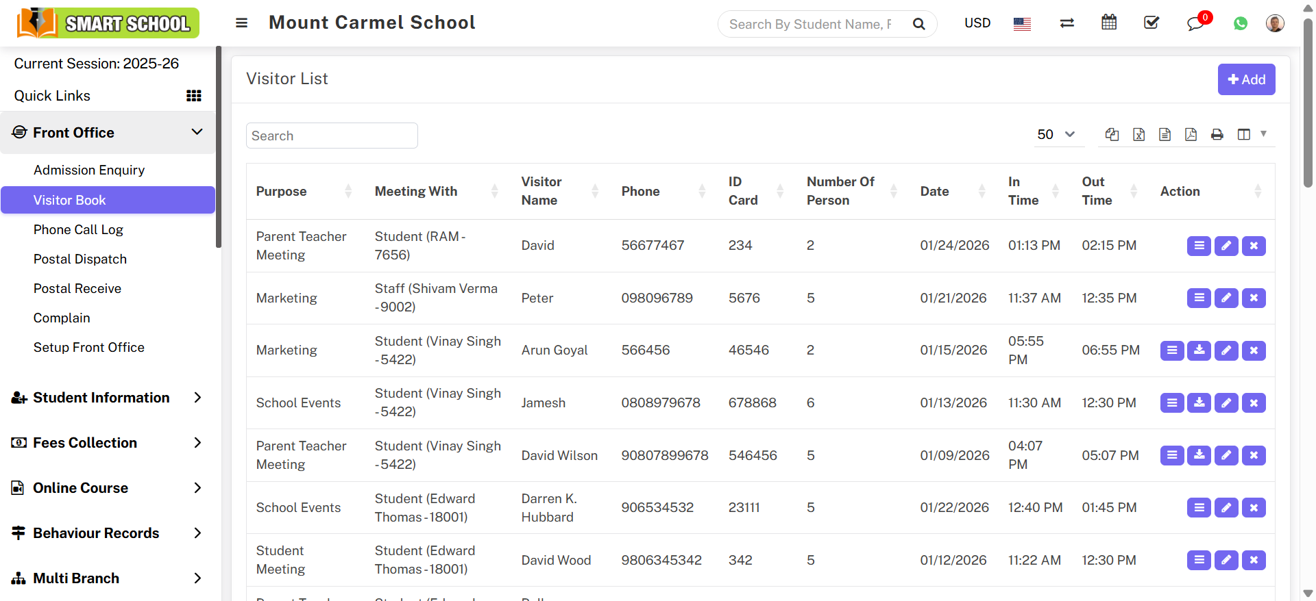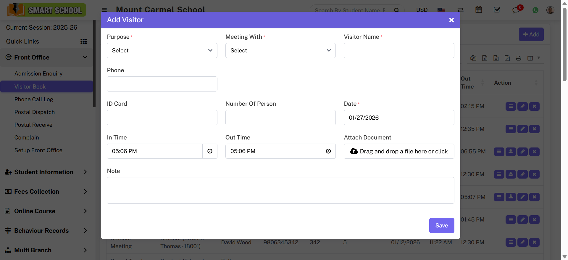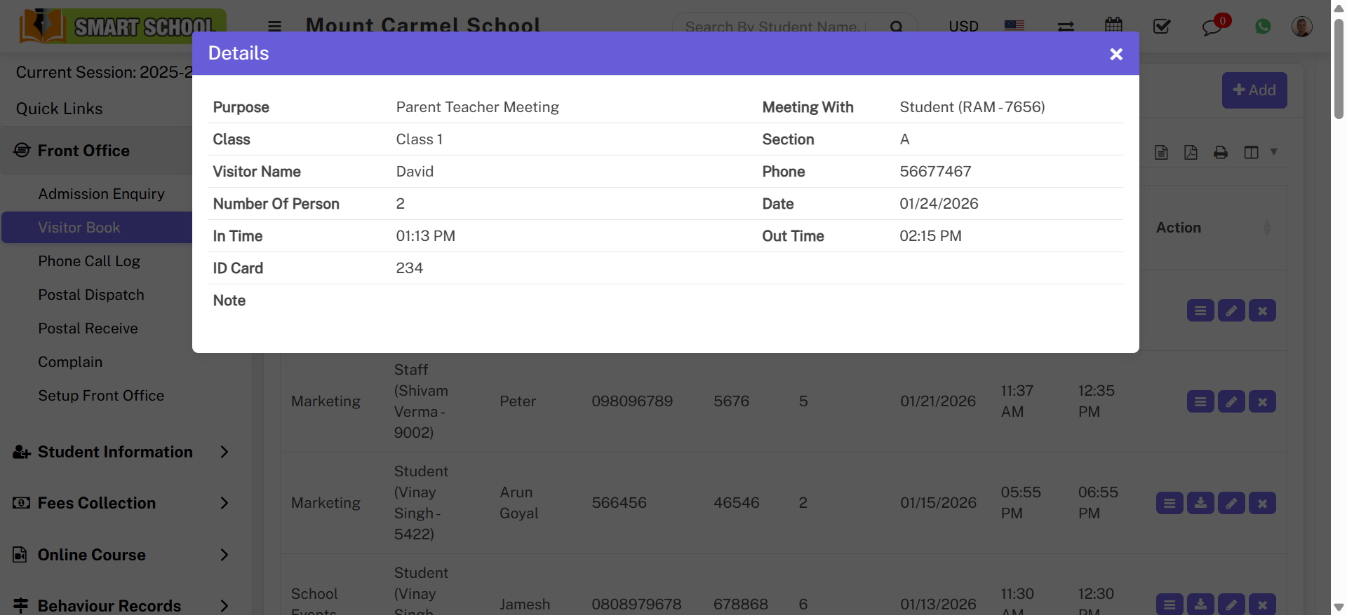Here Add Visitor, select the Purpose, Meeting With (in meeting with, when you select the student, three new fields will be appear in add visitor model which are class, section and student).