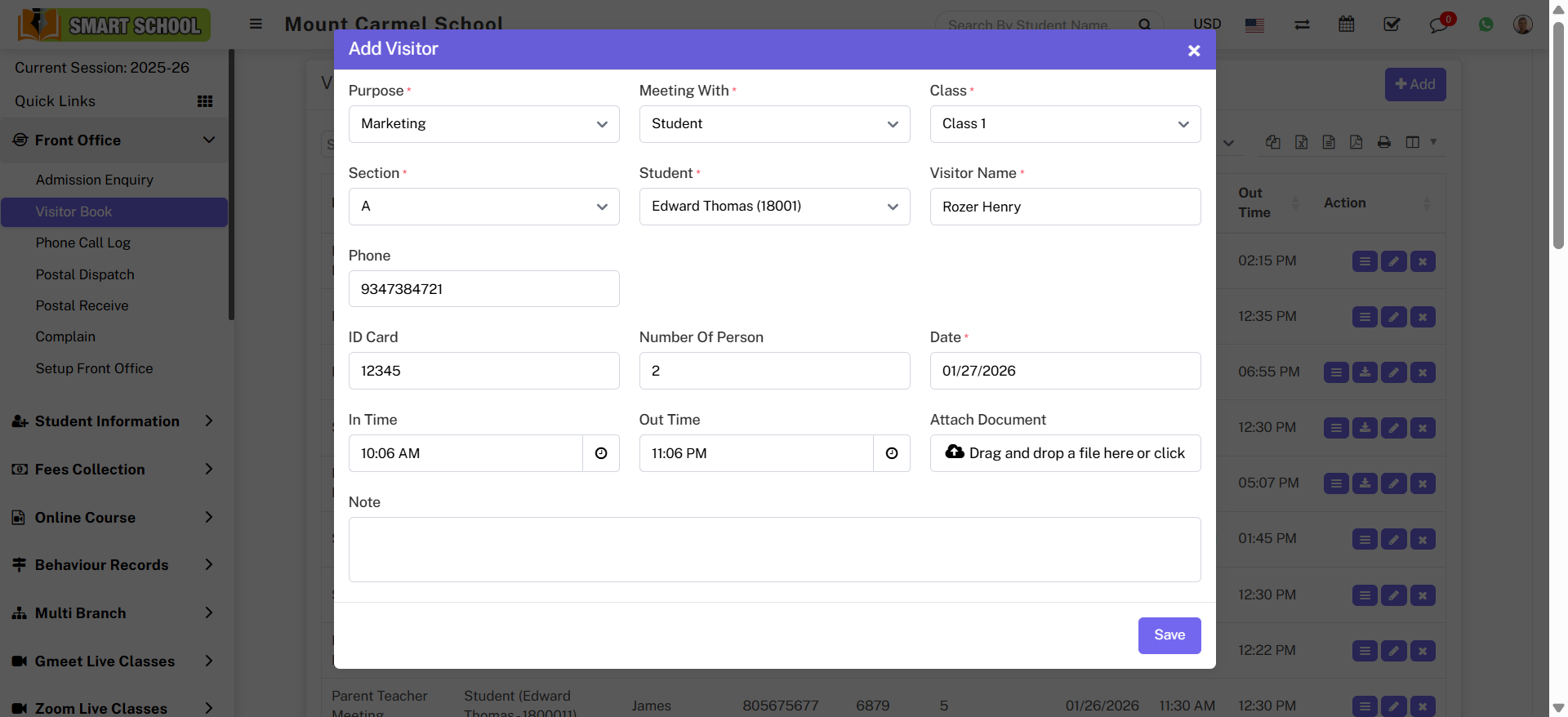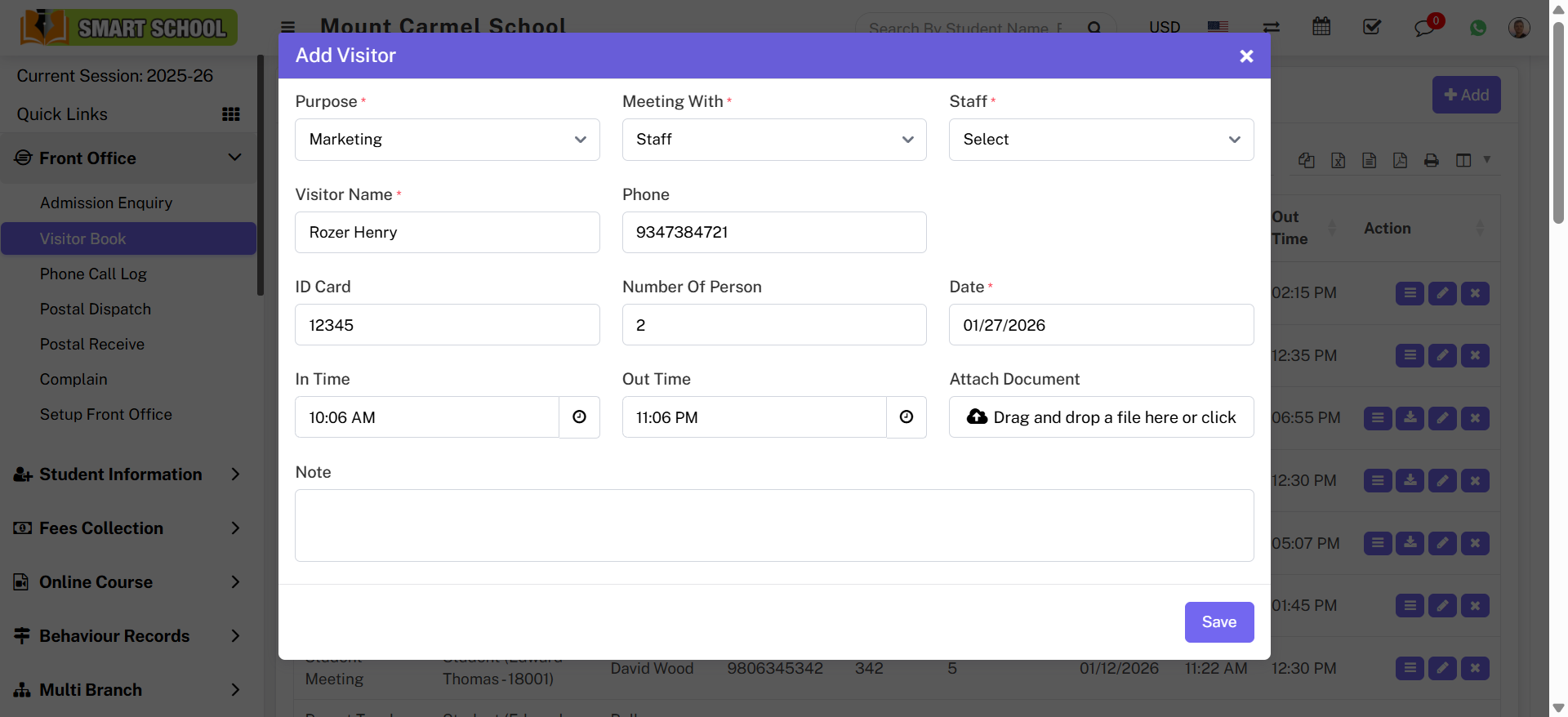 And now further fill the details as Visitor Name, Phone, ID Card, Number Of Person, Date, In Time, Out Time, Attach Document and Note and then click on the Save button. You can view this added record in front page of visitor book.