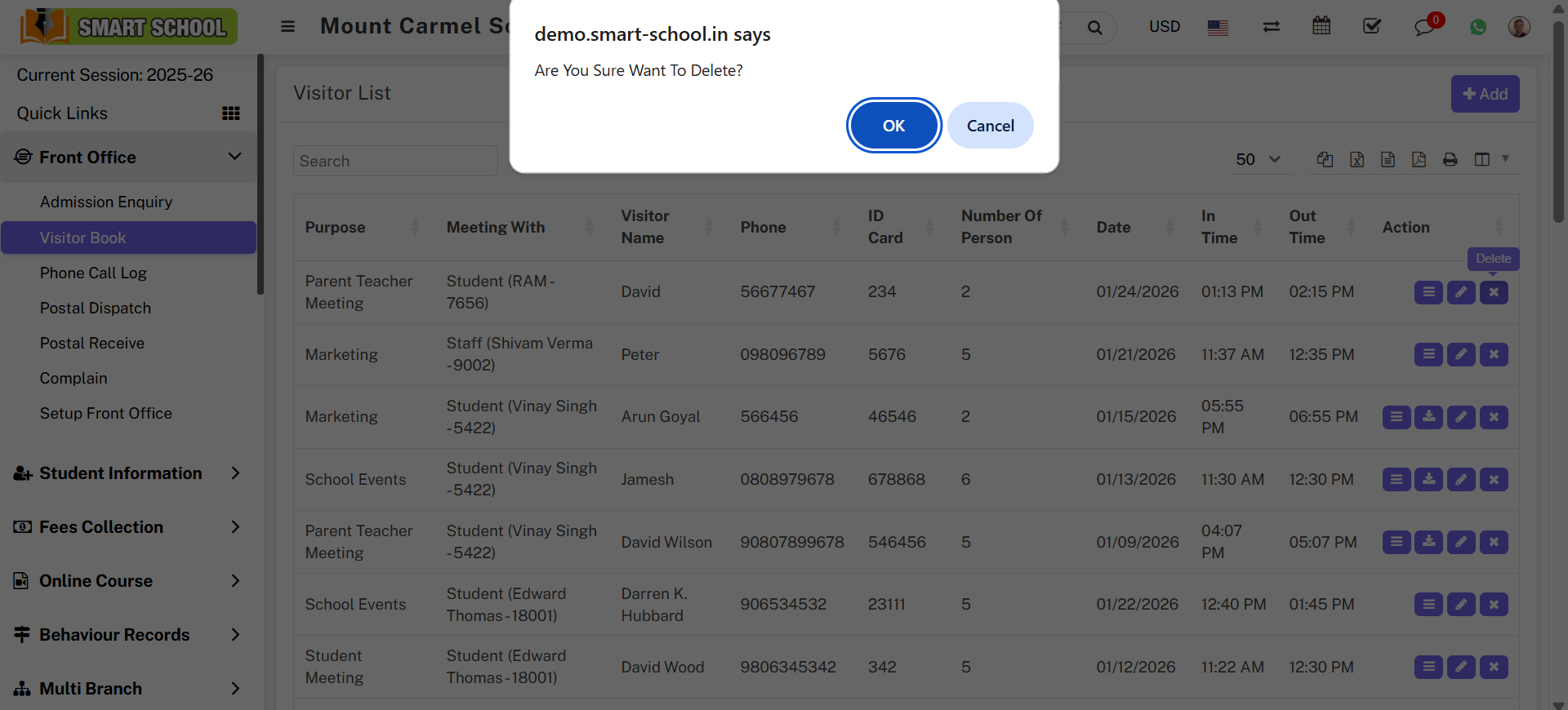 To delete visitor click on Delete icon present in the visitor list, Confirmation model will be open.