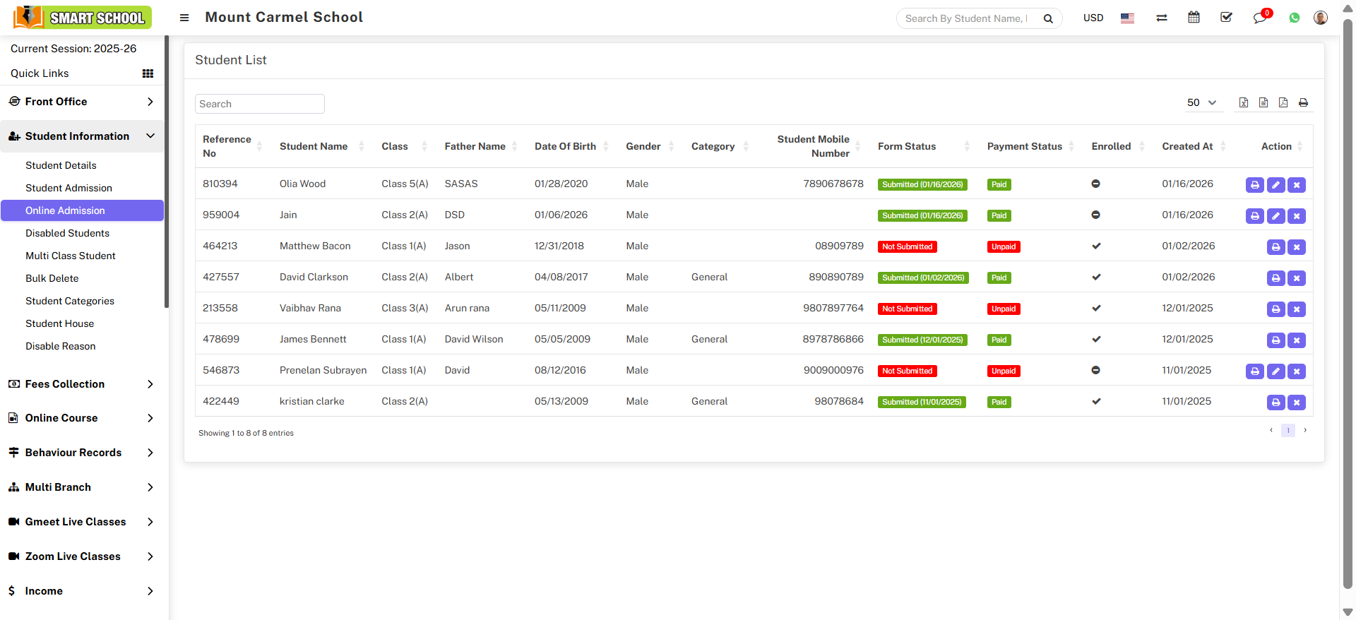 To assign fees at the time of Student Enrolment, go to Student Information > Online Admission, the student list will be open, and the Edit icon will be visible in the Action column.