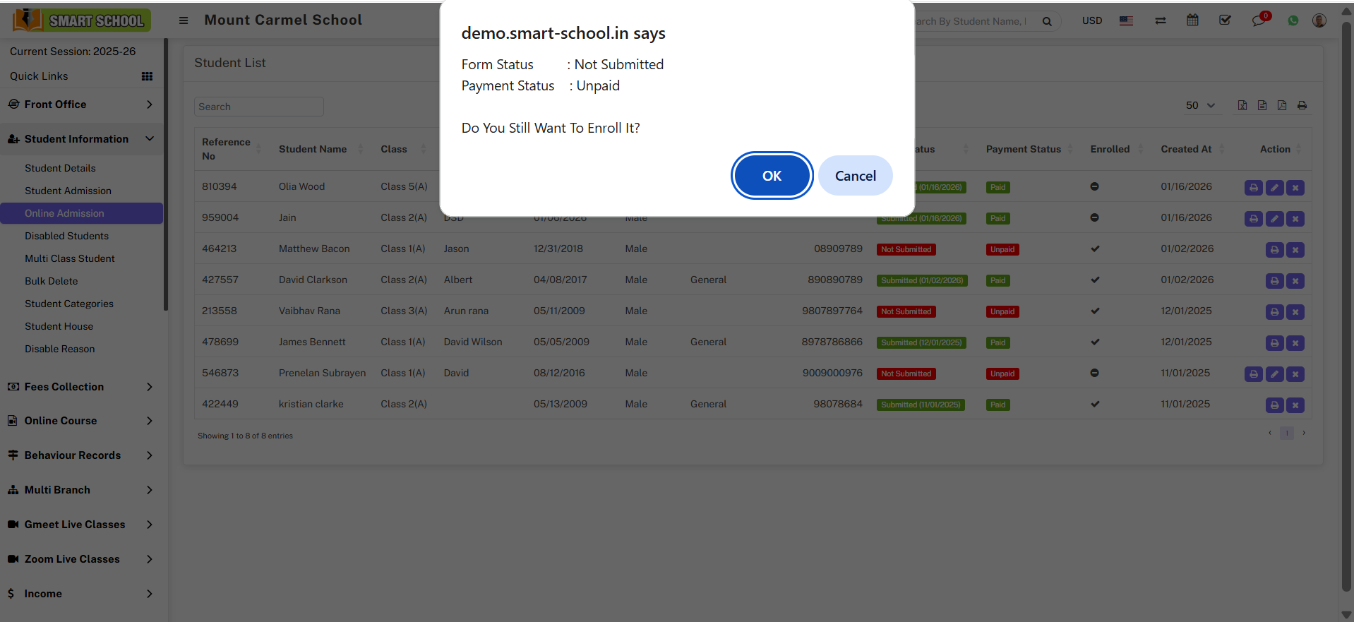 If you did not pay the fee at the time of online admission, you need to enrol that student. For that, just click on the Edit icon, which is showing in the Action column, so that the Confirmation Model will appear. When you click on the OK button,
