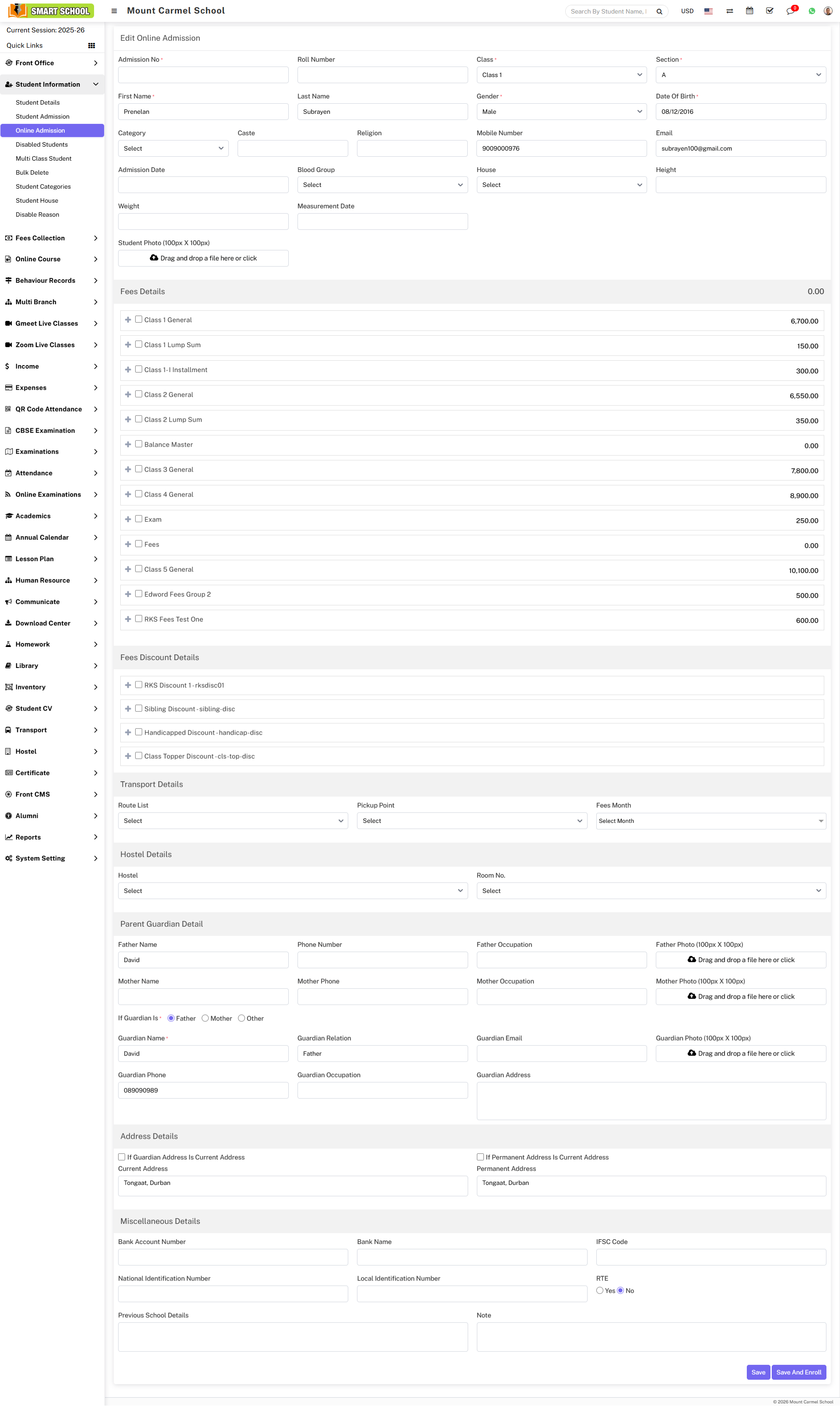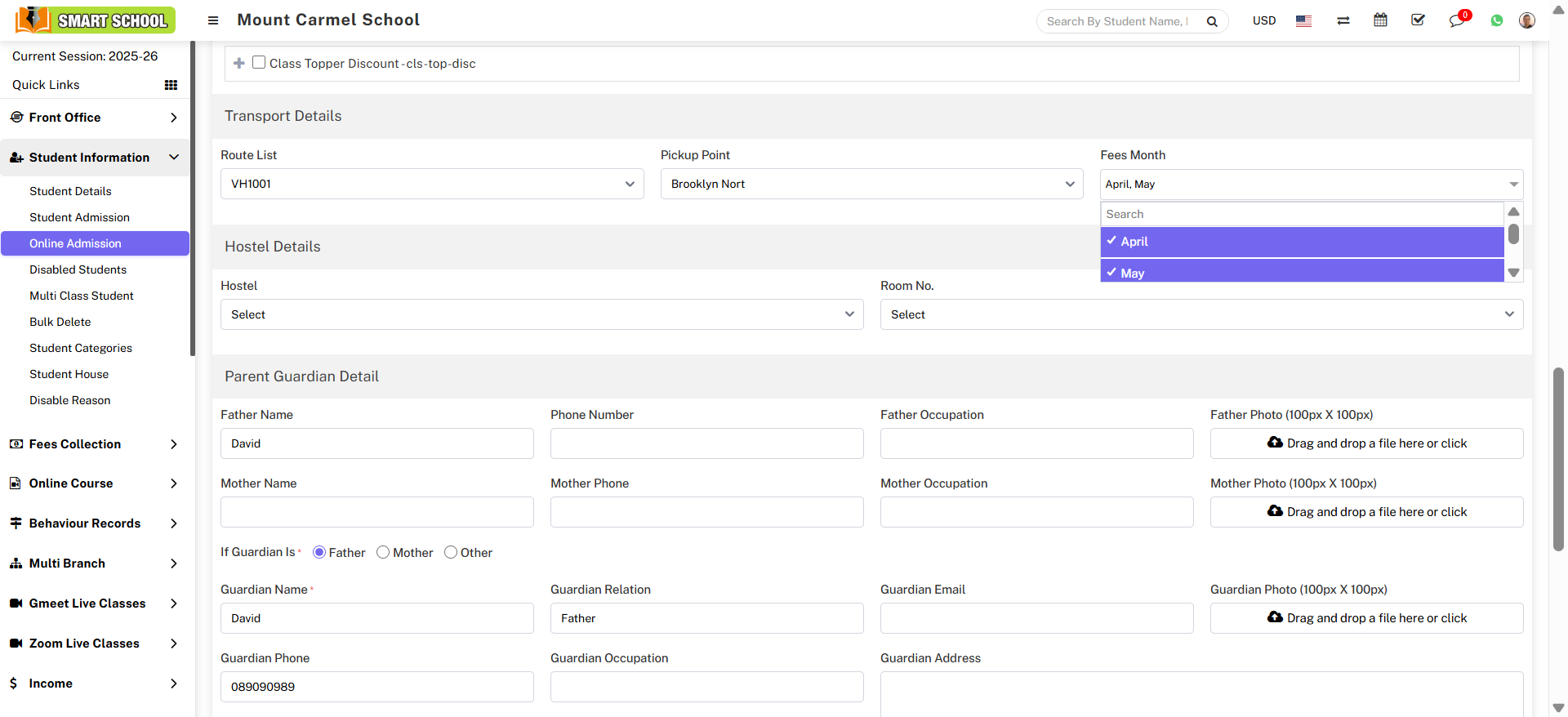 the Student Admission form will open, where you can easily assign multiple fees from the Fee Details, and you can also assign the transport fees from the Transport Details.