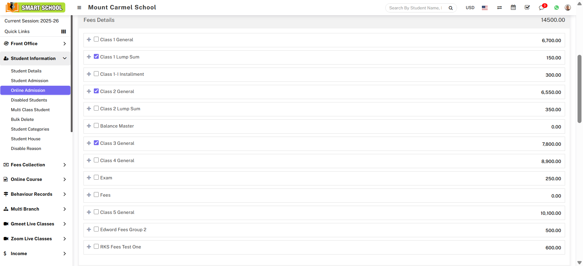 Multiple fee options are displayed in the Fee Details field. A plus icon and a check box are displayed next to the fee name. You can expand the fee details, such as fee type, due date, and amount, by clicking the Plus icon, and you can assign those specific fees to that student by checking the appropriate check box.