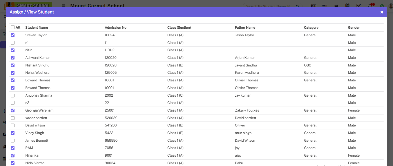 To Assign / View Student model, you can access the student list along with their details. By checking or unchecking the corresponding checkbox, you can assign or unassigned students for the exam. After making the necessary changes, click on the save button to successfully assign or unassigned the exam to the student.
