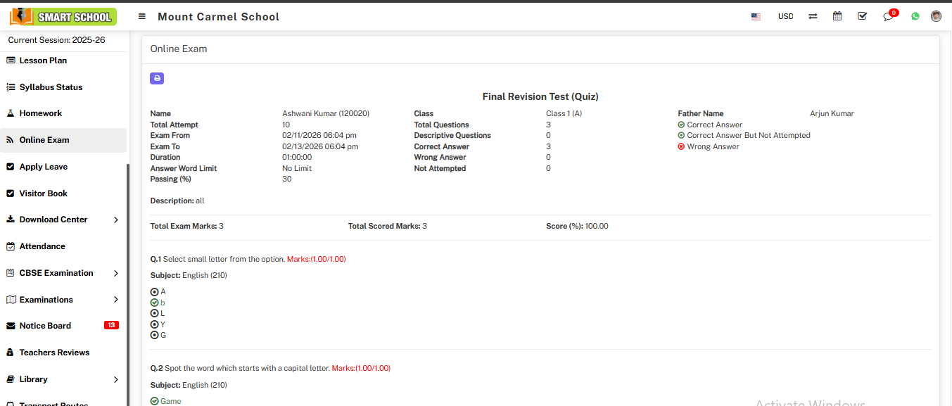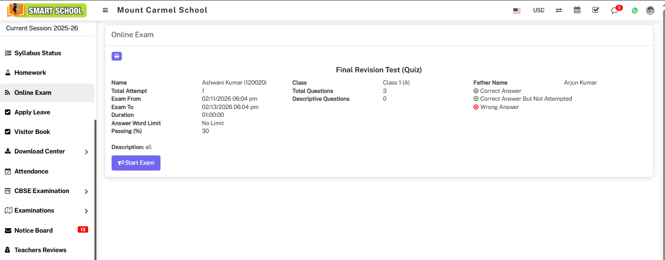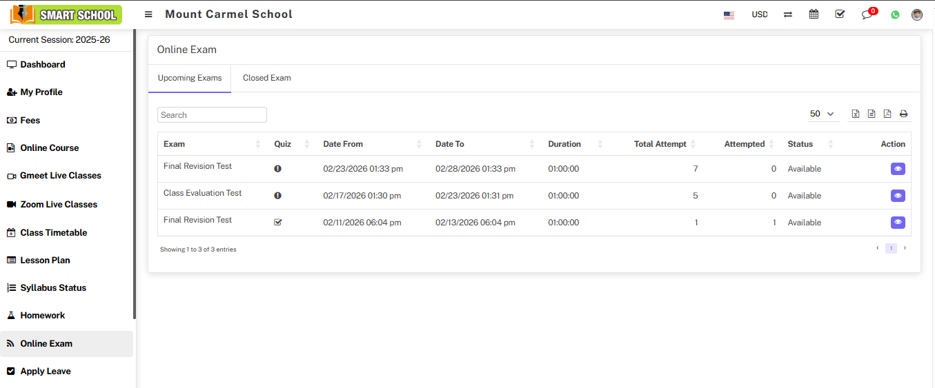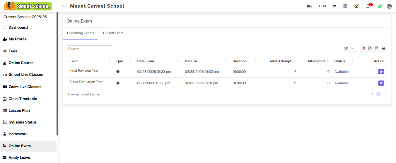 To attempt exam, go to sidebar menu and click on Online Exam. Here student can see all the available online exam. In online exam you can see Upcoming Exam and Closed Exam section are available.