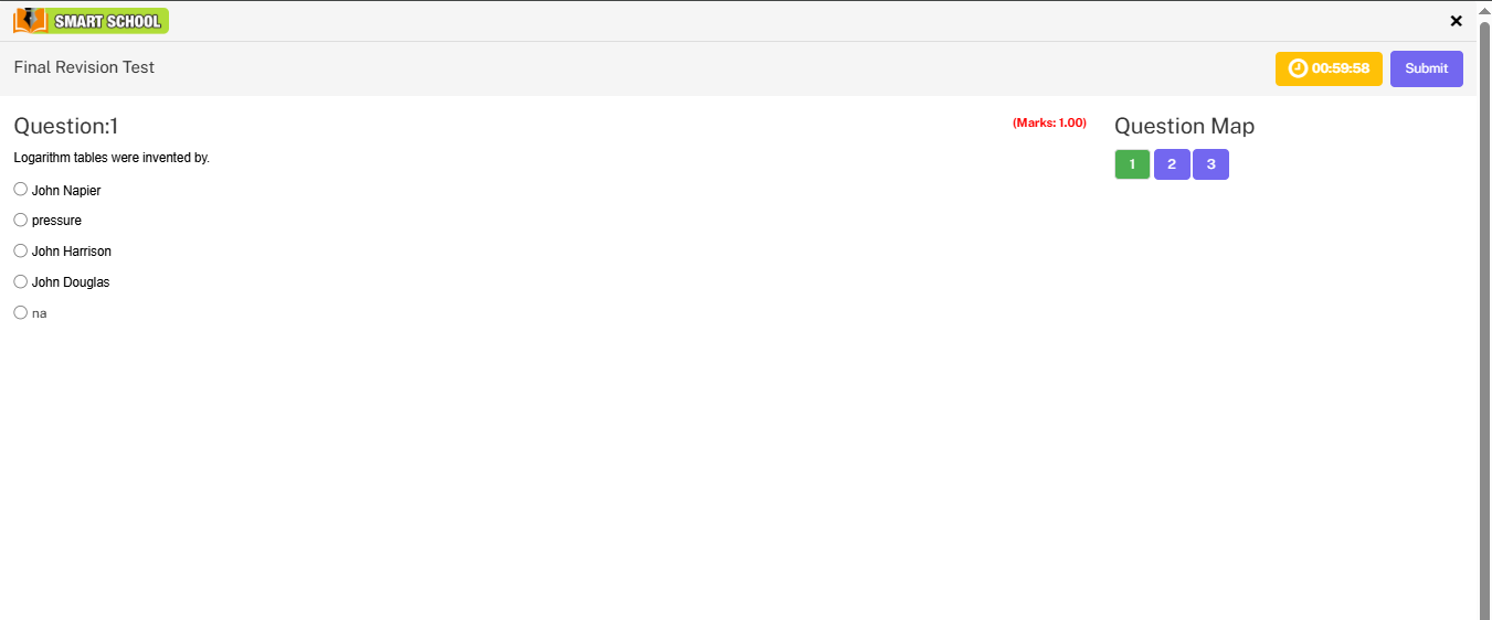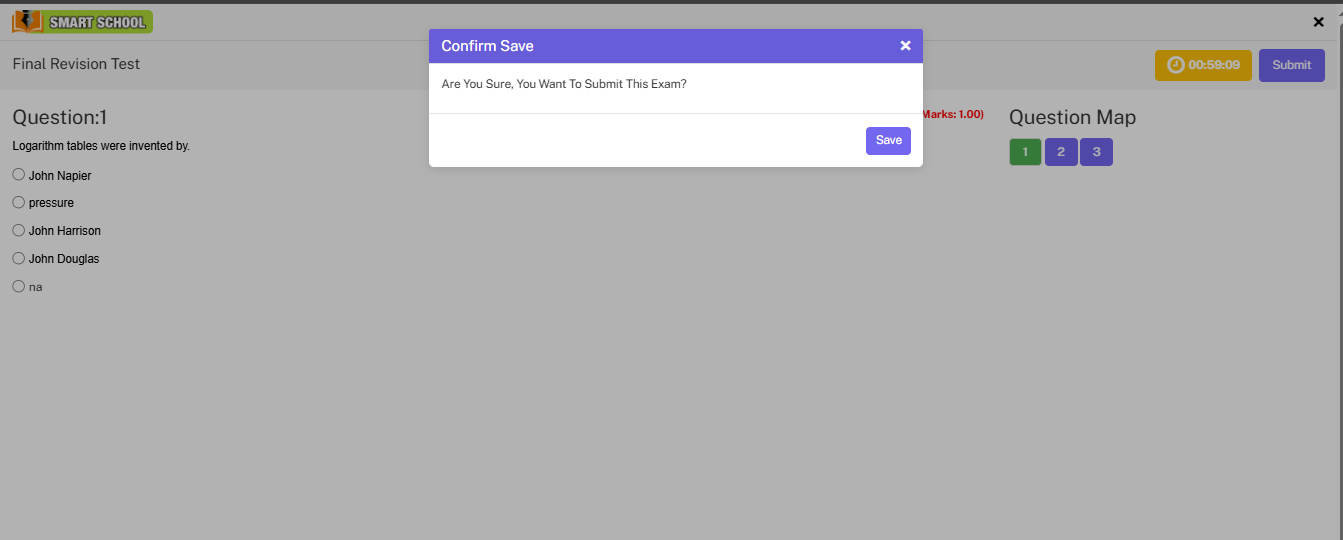 After attempting all the questions you can submit the exam by clicking on Submit button showing at the top right corner of the page, confirmation model will be open to ensuring to submit the exam.