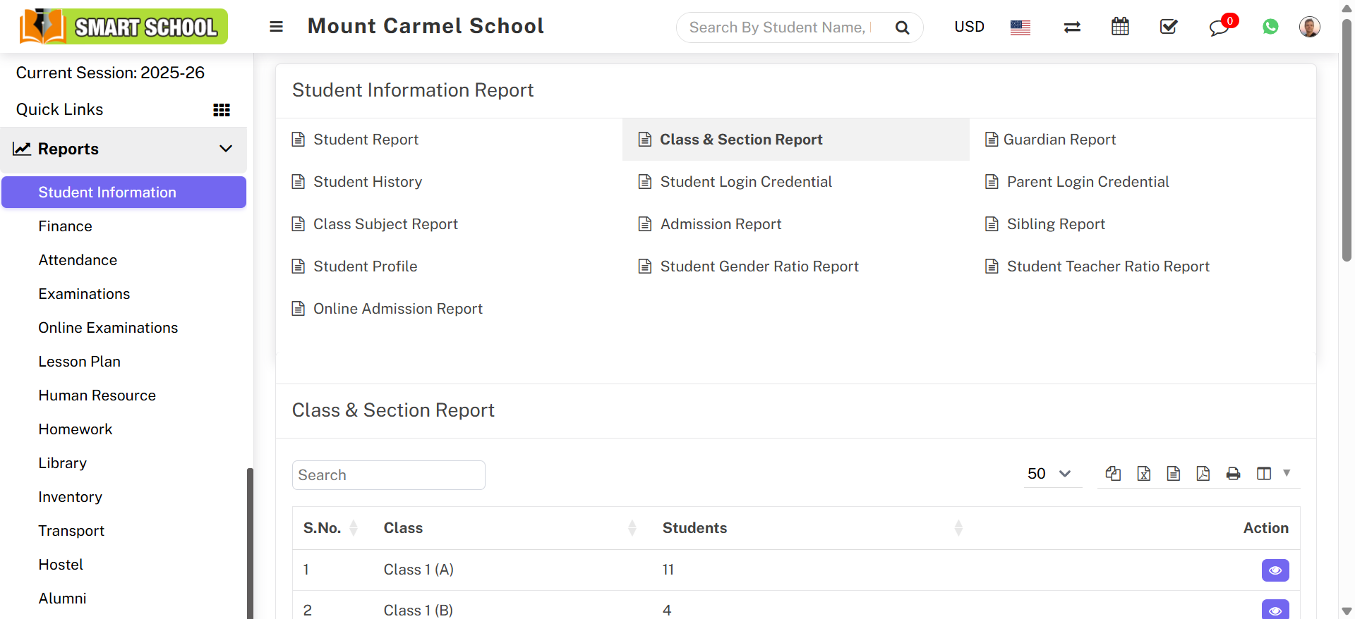 To check class & section report, go to Report > Student Information then click on Class & Section Report. Here you can see class section wise student list.