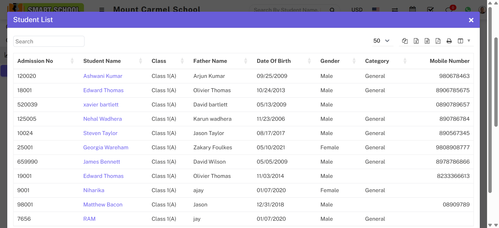 To view student list , click on the View icon present in the Action column, at click of this icon a modal will open where you can see student's details like Admission No, Student Name etc.