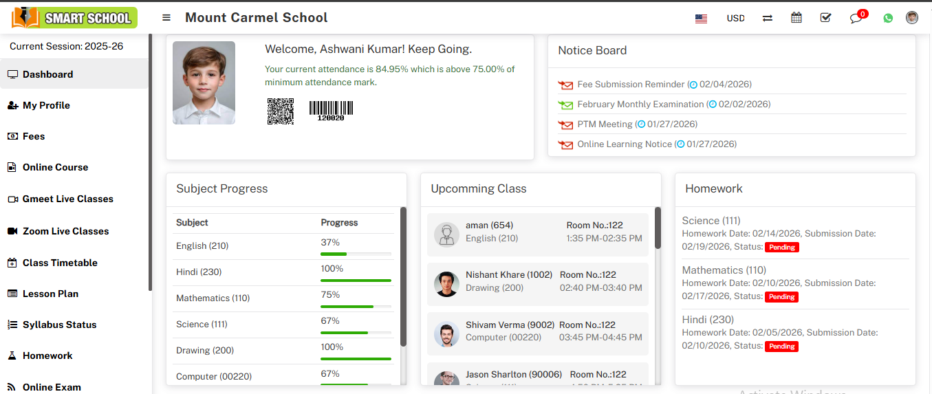 Here, you can see the student profile page, and below it, you will find the CBSE Examination module. Simply click on the CBSE Examination module to access two options: Exam Result and Exam Schedule.