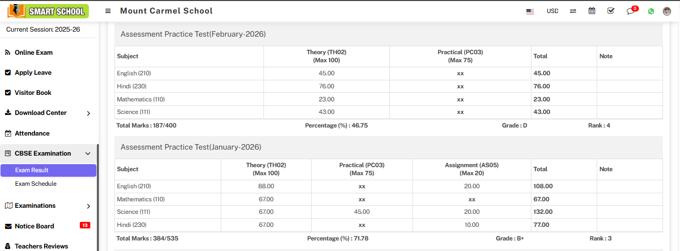 Now, click on 'Exam Result', and the CBSE Exam-wise results will open on the right side. On this page, you can view the exam-wise results that have been published by the Superadmin. The result displays subject-wise marks, as well as the total marks, percentage, grade, and rank for that exam.