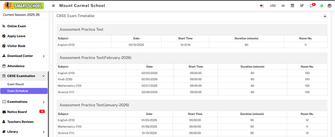 On the right side, you can see schedule for the upcoming exams that has been published by the Superadmin. In exam schedule, you can see the information about the exam such as number of subject of exam, exam dates, start times, durations, and room numbers.