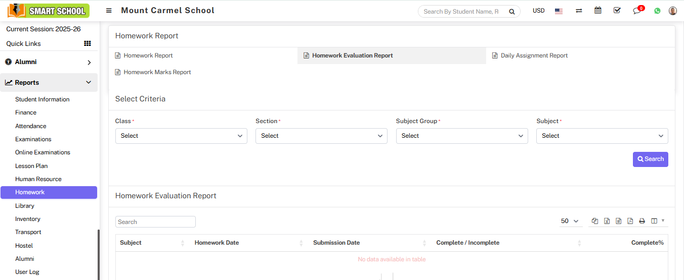 Now select Class, Section, Subject Group and Subject and then click on Search button. The homework evaluation report for above search will be show in below.