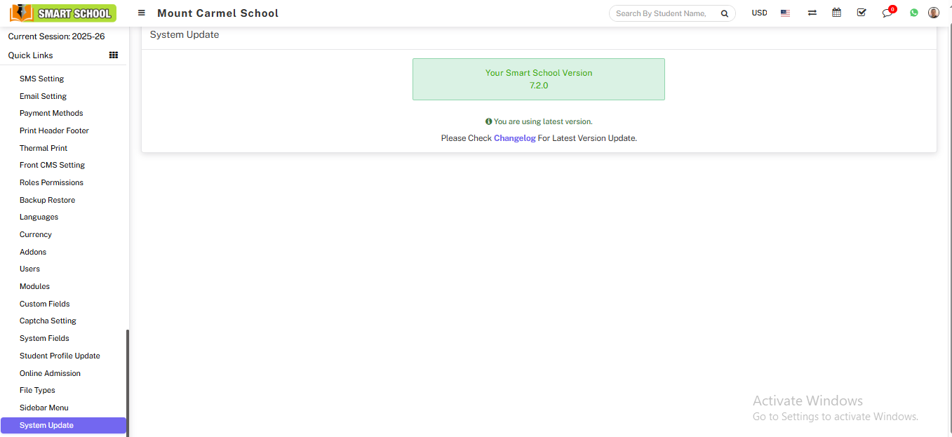 To check Smart School Version, login from superadmin panel and then go to System Settings > System Update link. Here you can see your current Smart School Version and also update to the newest version if available any.