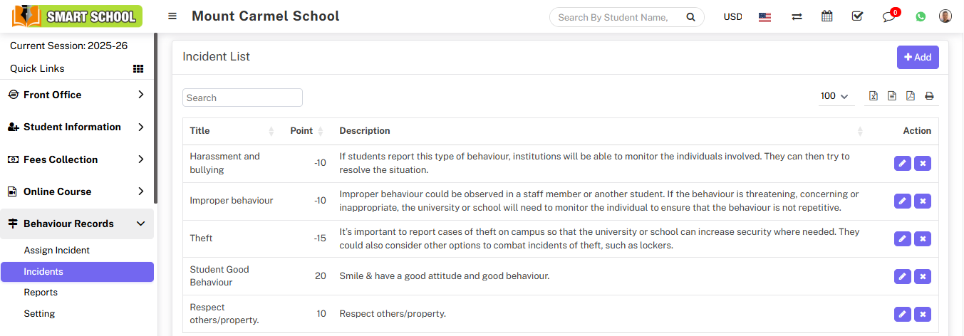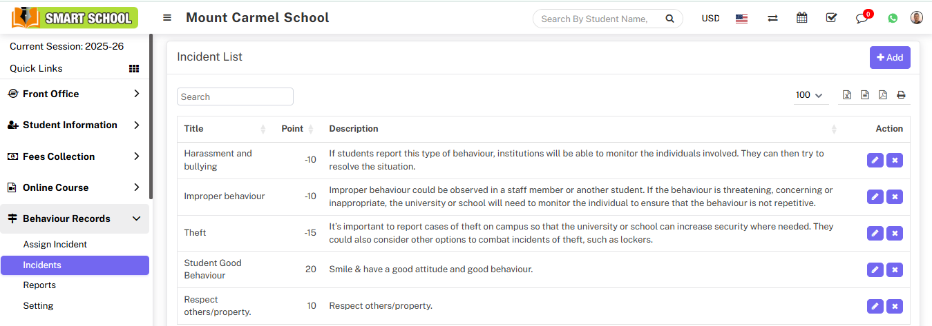 Now, in the incidents list table, you can see the columns of title, point, and description. The incident name appears in the Title column, and the incident point appears in the Point column, depending on whether the incident was positive or negative. If incidents are positive, students will get the positive point, and if incidents are negative, students will get the negative points. In the third column of the description, you can see the description of the incident.