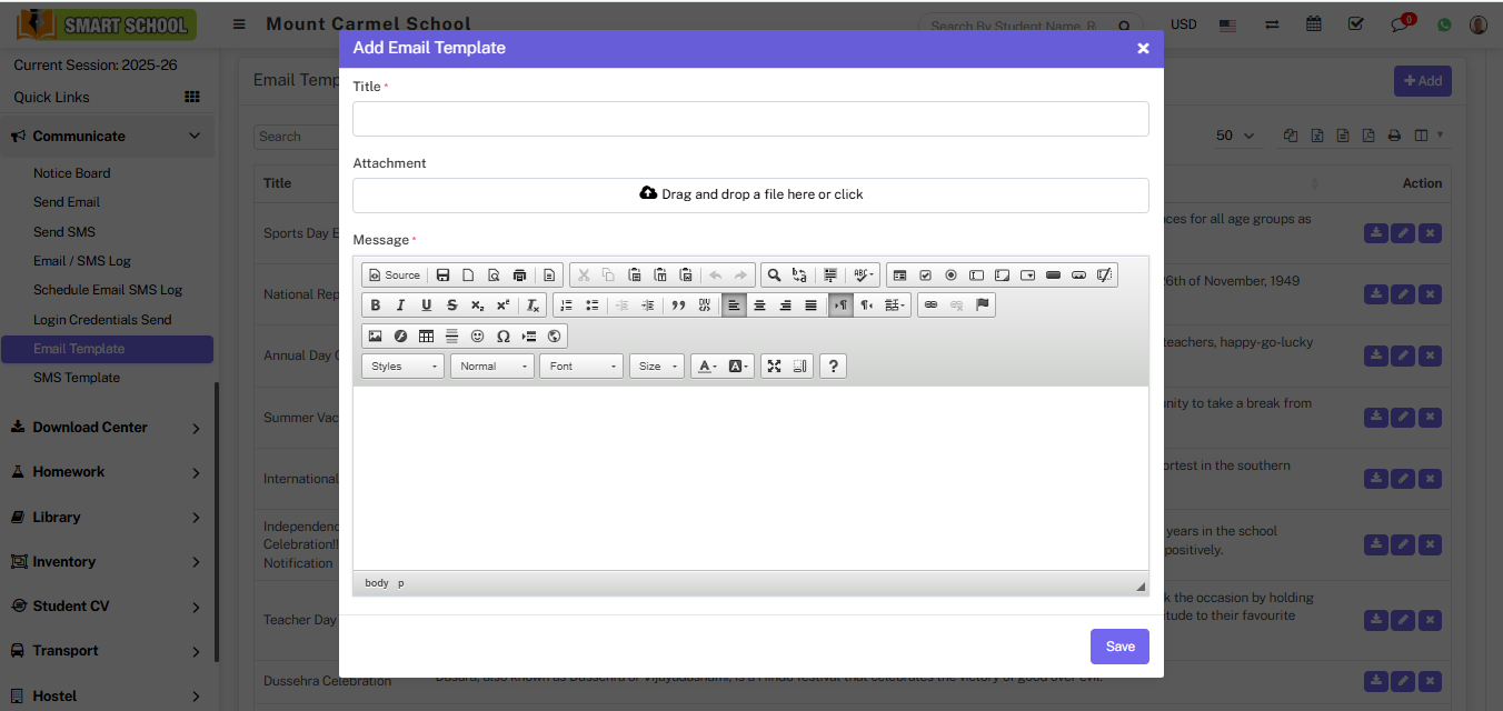 Now, mention the Title for email template, and select the file for Attachment and create the message then click on the Save button, so that new email template will added successfully and you can view in Email Template List.