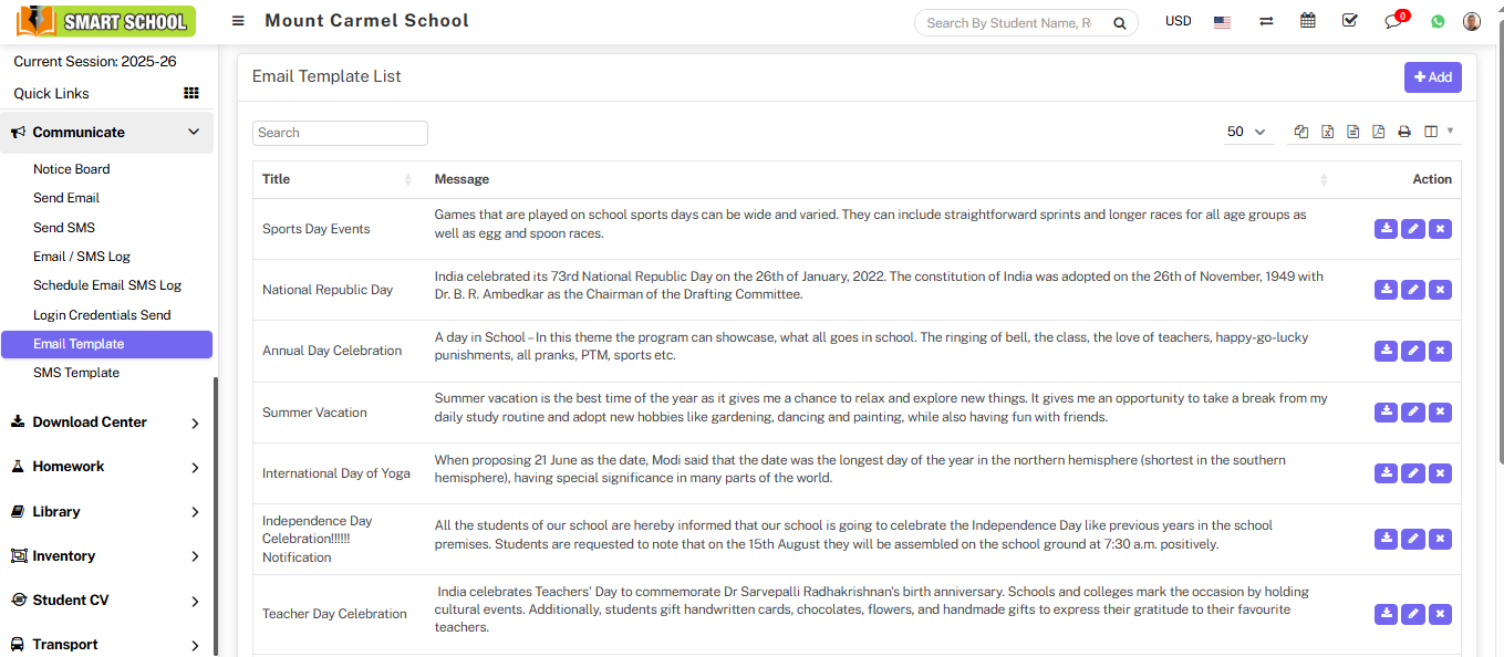 To create Email template, go to Communicate > Email Template, here you can view email template list.