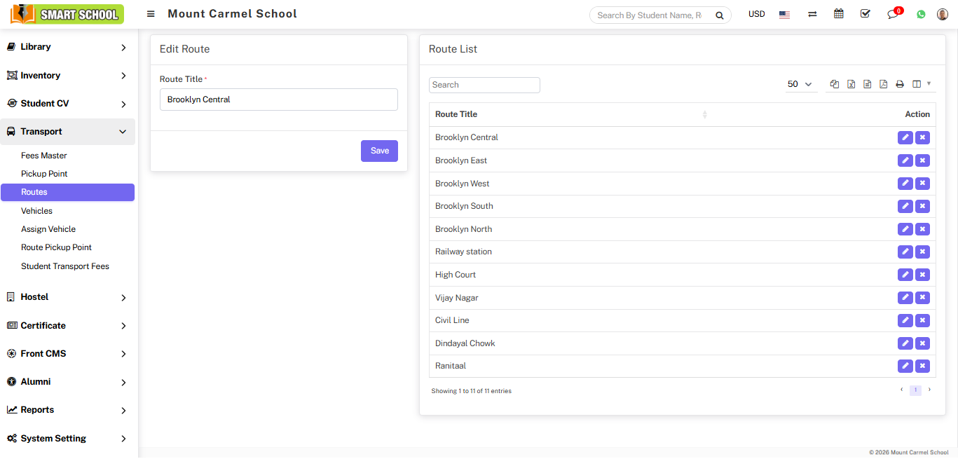 To edit route, click on the Edit icon showing in action column, edit route model will appear, now update the route and click on save button, your update will be change successfully.