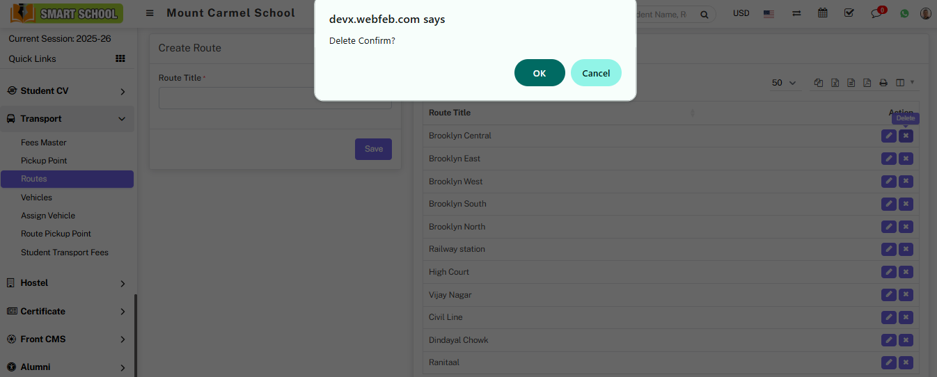 To delete the created route, simply click on the Delete icon in the Action column to delete a route, a confirmation model will appear.