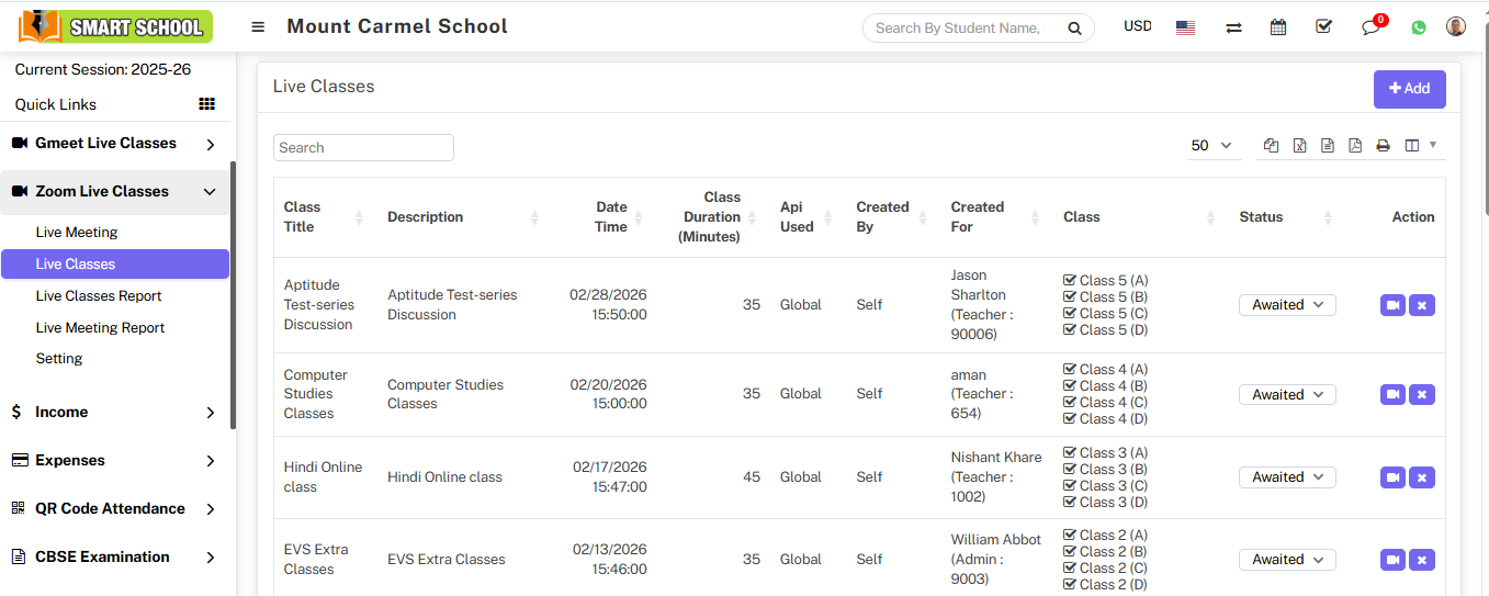Once you created Zoom Live Class you can see Live Class List according to date(decending) in the Live Classes page.