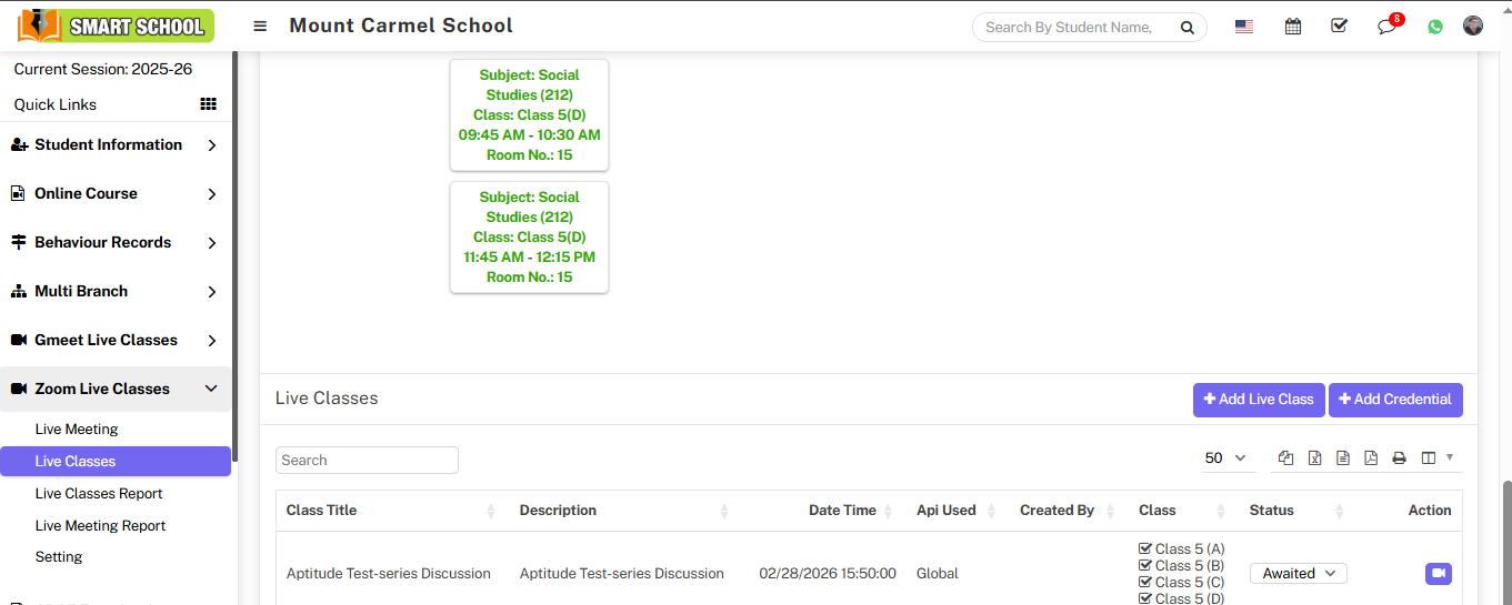 In Teacher login to create Live Class go to Zoom Live Classes > Live Classes, click on any period at timetable to open Add Live Class.