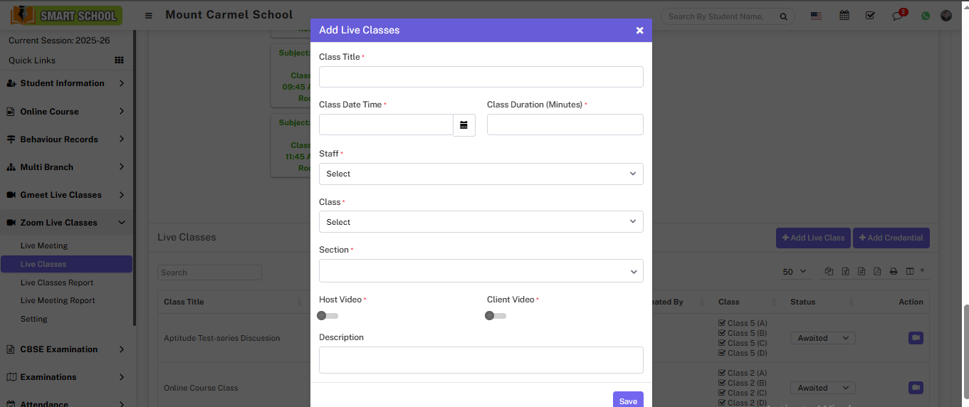 Here enter Class Title, Class Date, Class Duration (Minutes), Role, Staff (select teacher/staff who will take this class), Class, Section, Host Video, Client Video, Description details for live class then finally click on Save button.