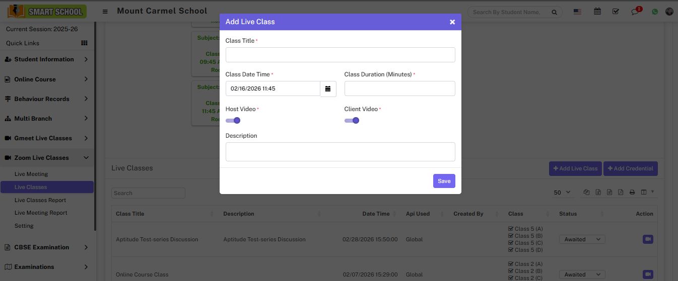 Here enter Class Title, Class Date, Class Duration (Minutes), Host Video, Client Video, Description details for live class then finally click on Save button.