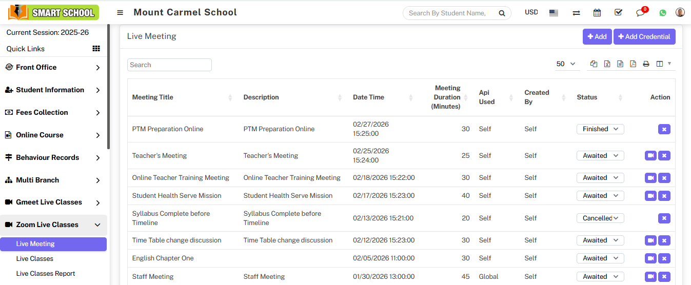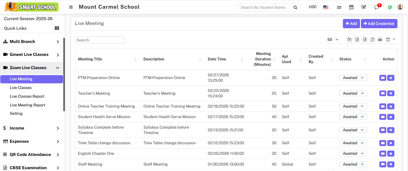 By default created Live Meeting status will be Awaited further you can set status of the Meeting as Finished or Cancelled. Start Meeting or Join button will only show when status of Live Meeting is as Awaited.