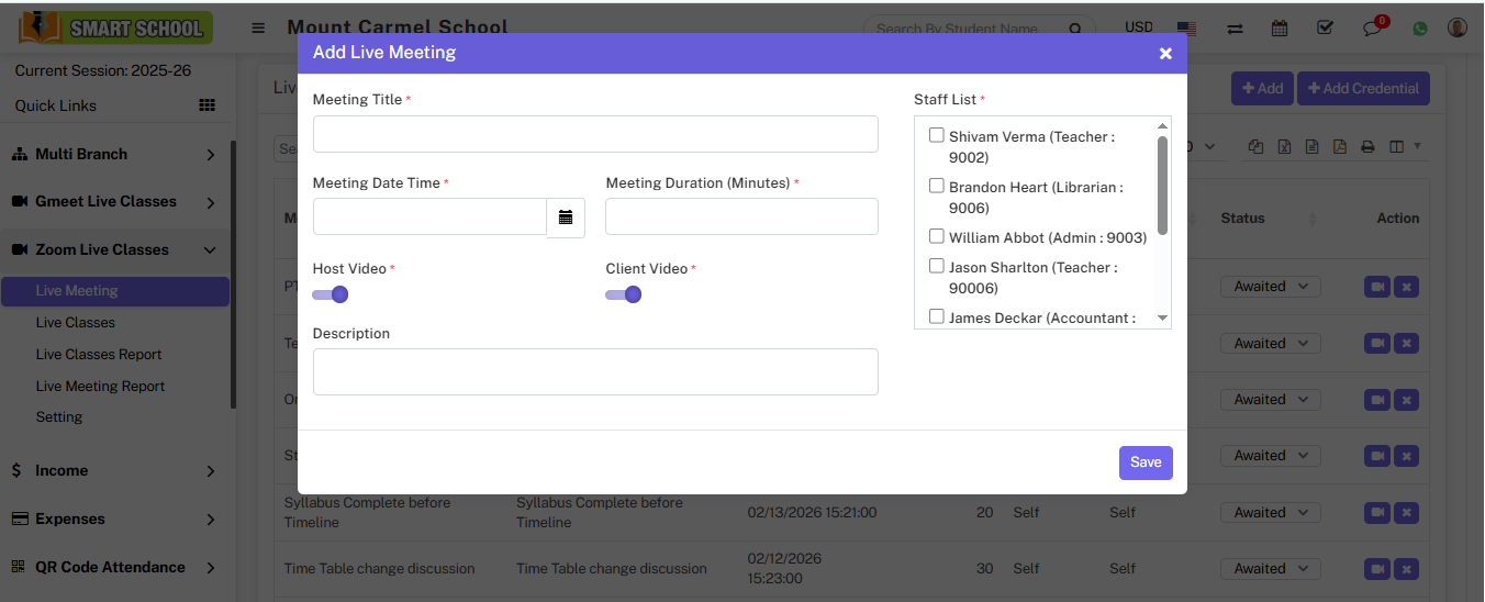 Add live meeting modal will be open, Here enter Meeting Title, Meeting Date, Meeting Duration (Minutes), Host Video, Client Video, Description, Staff List details for live class then finally click on Save button.
