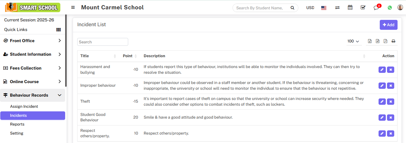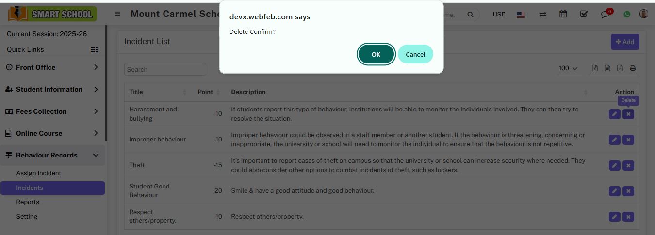 To delete the incident from the incident list, go to Behaviour Records > Incidents. When you click Incidents the incident list page will open.