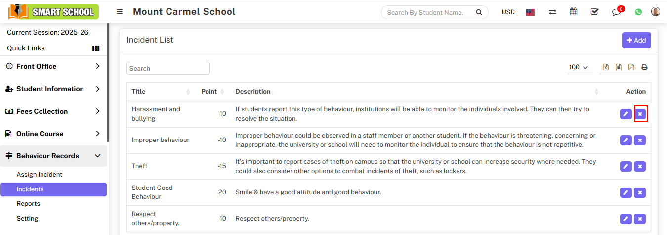 The Action column can be found in the right-hand corner of the incident list page. In the Action column, you can see the cross icon is available. You can delete any incident you want by clicking on this cross icon.