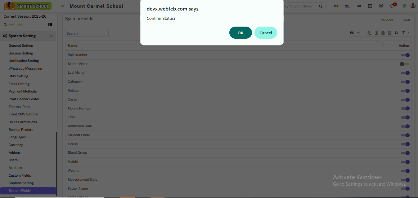 To disable system field, go to System Settings > System Field. Here you can see all enabled field. You can enable/disable any system field in student and staff.
