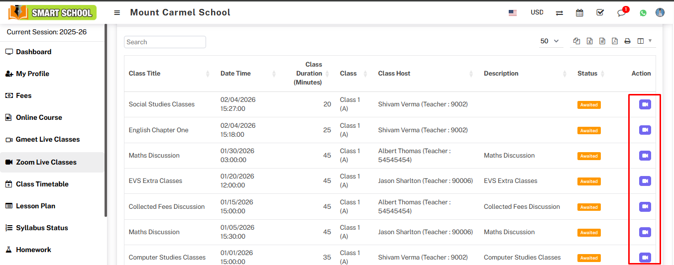 and the Join button will be shown in the Zoom Live Class module at parent side.