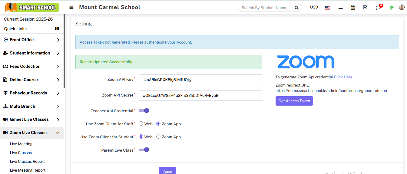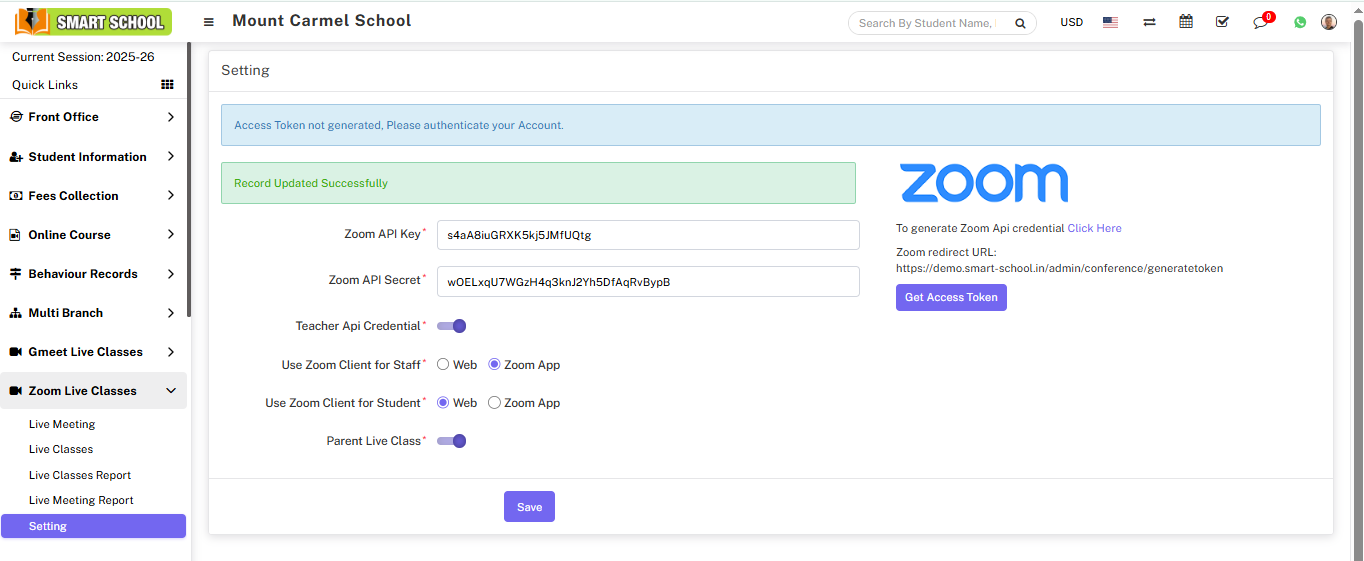 To enabled and disabled the parent from the zoom live classes, Go to the Zoom Live Classes > Setting.