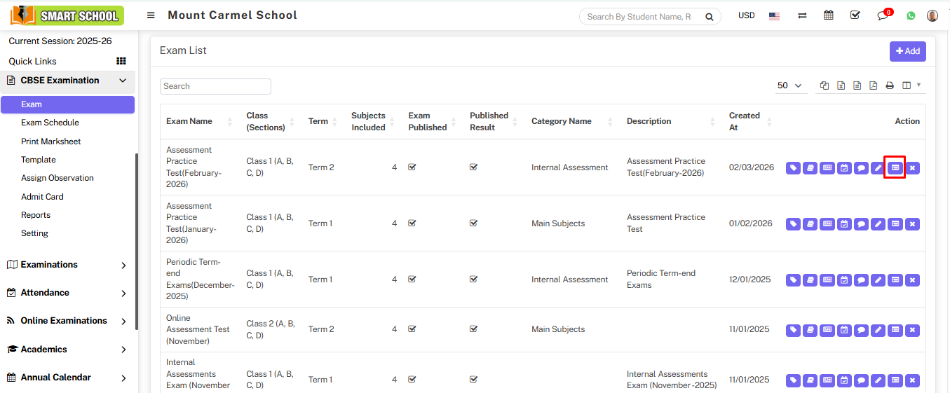On the right side, you can see the Exam list. Within that list, on the right side, there is an action column where you can find the delete icon. Additionally, beside the delete icon, there is also the Generate Rank icon available.