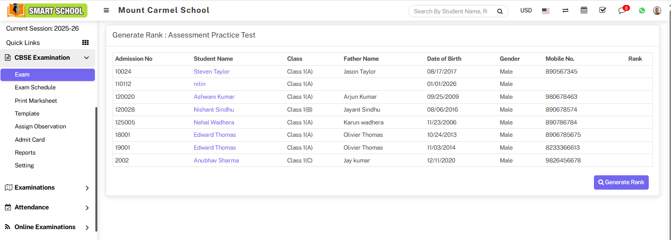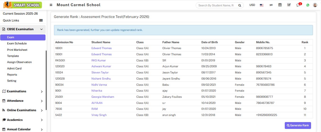Now click on Generate Rank icon, Generate Rank page will be open. On this page, you can view the list of student details, including the student's admission number, student name, class, and father’s name, date of birth, gender, mobile number, and rank. Initially, the rank column will be blank until you generate the rank.