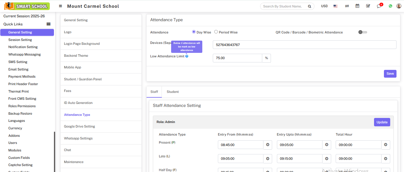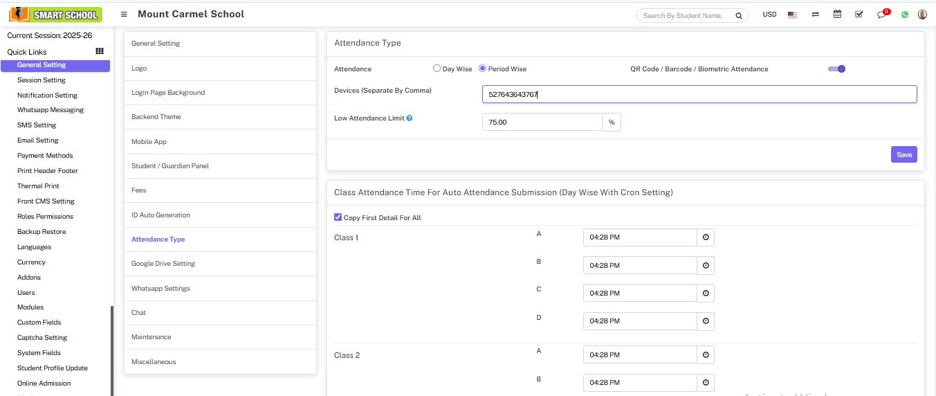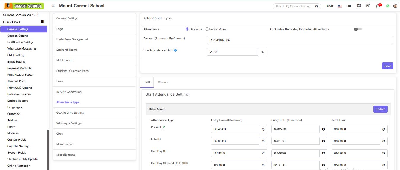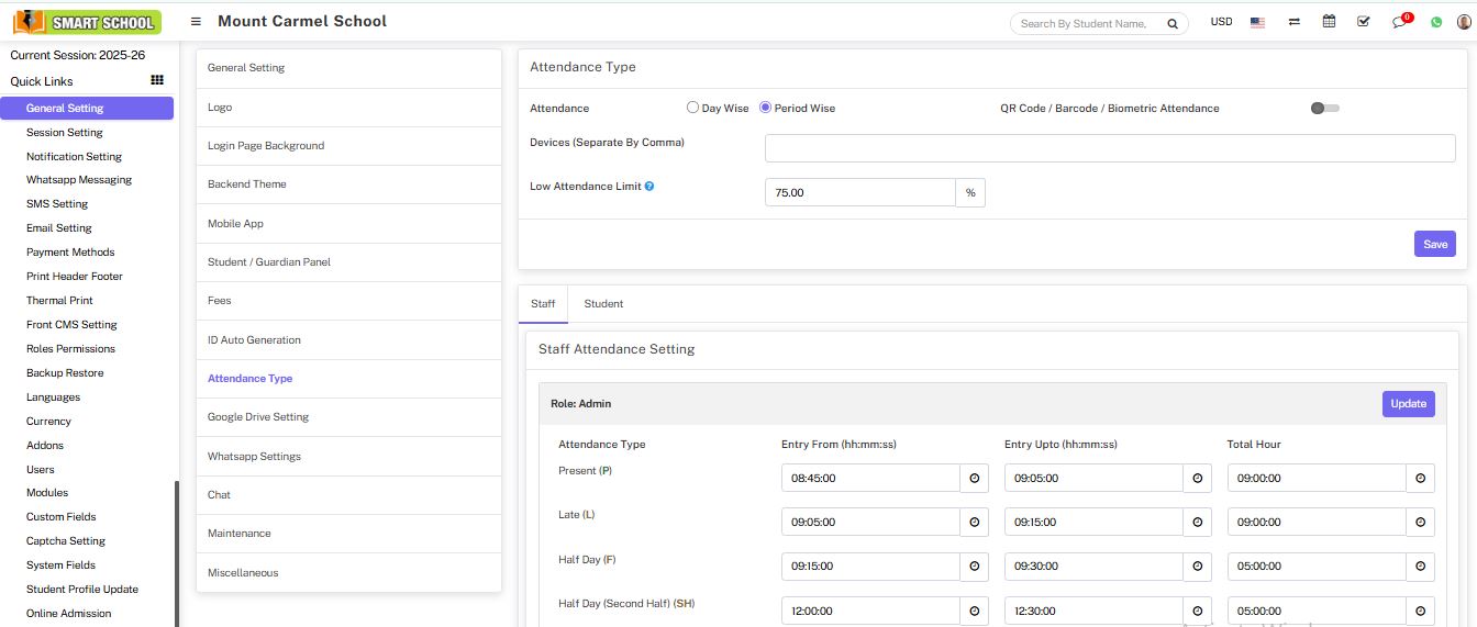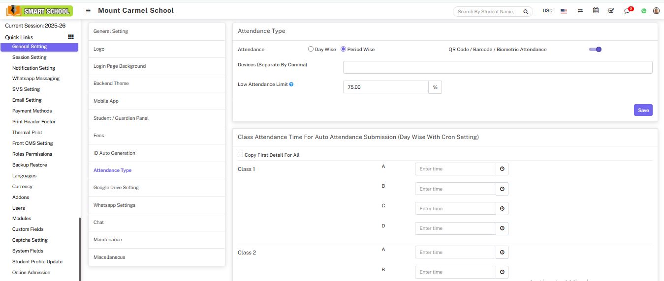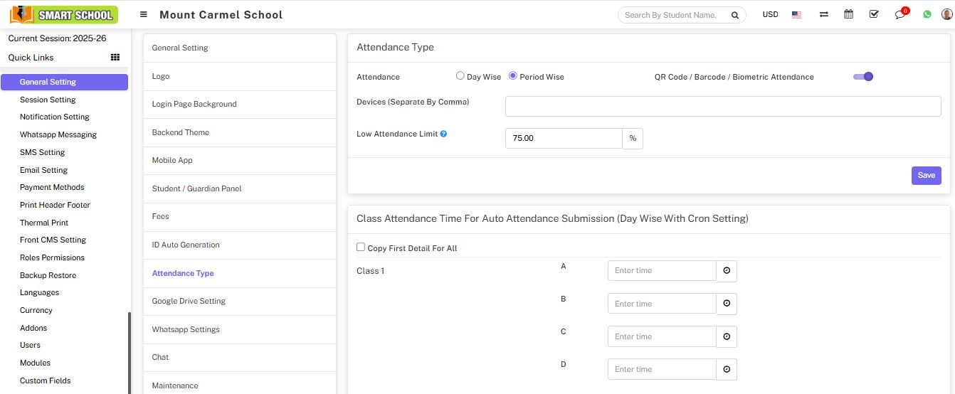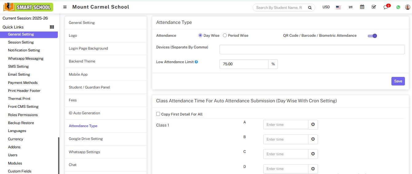 Attendance module workflow: In smart school, we can use two types of attendance (Attendance and Biometric Attendance). You can run any type at time attendance day wise and period wise and attendance type can be select from System Settings > General Settings. In Attendance Type here select the any one attendance type Day Wise or Period Wise and click on Save button.