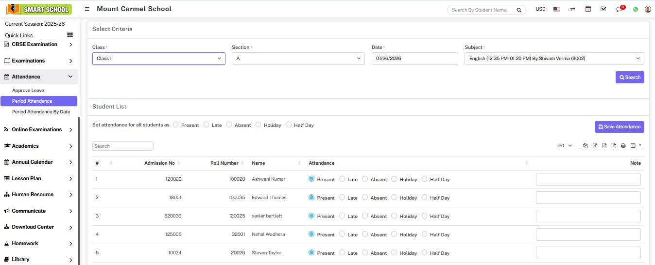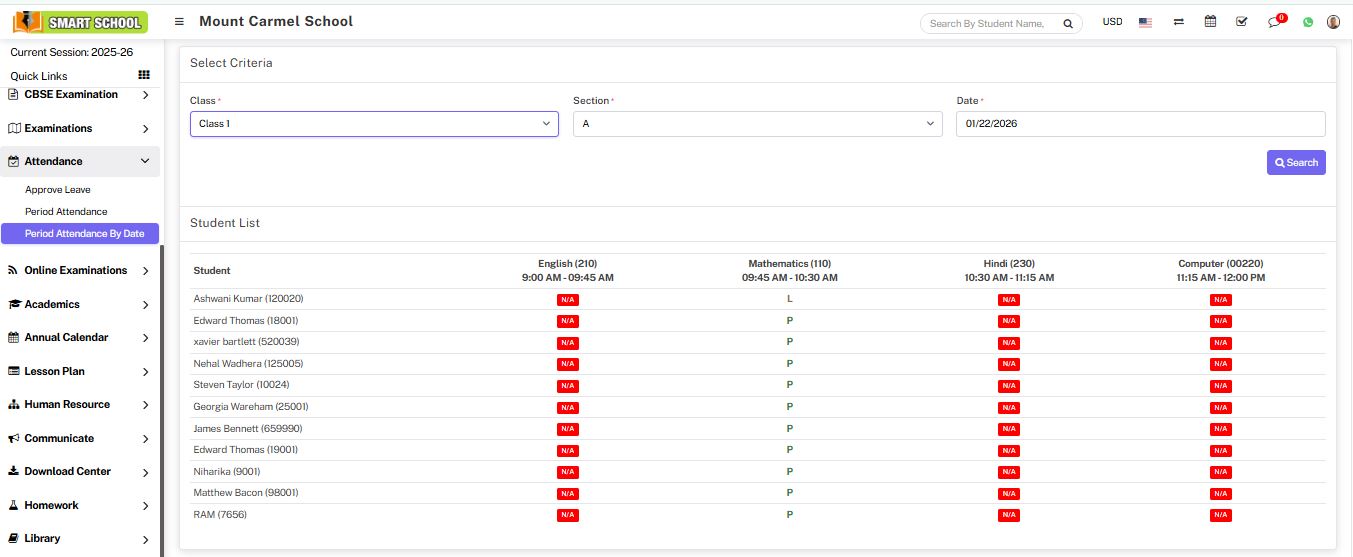 In period wise attendance, just you need to go attendance > period attendance by date. Here, you have to select the class, section, date and subject then click on the search button.